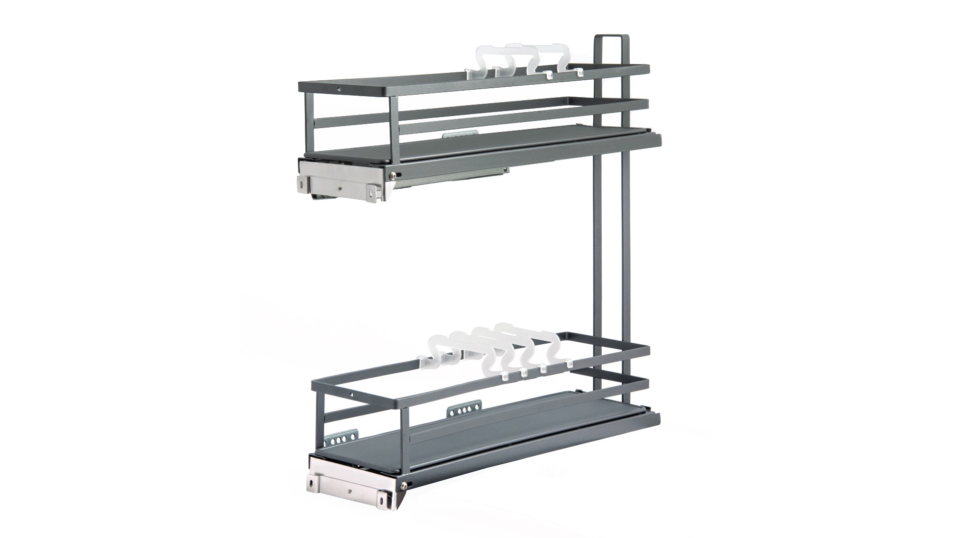 Модель обладает стильным европейским внешним видом, плоской формой боковых прутков корзин. Сплошное дно с антискользящим покрытием и дополнительные съемные делители FLORA гарантируют максимальную устойчивость хранимой утвари на обоих этажах. Кроме того, дно можно легко снять для чистки и мытья.