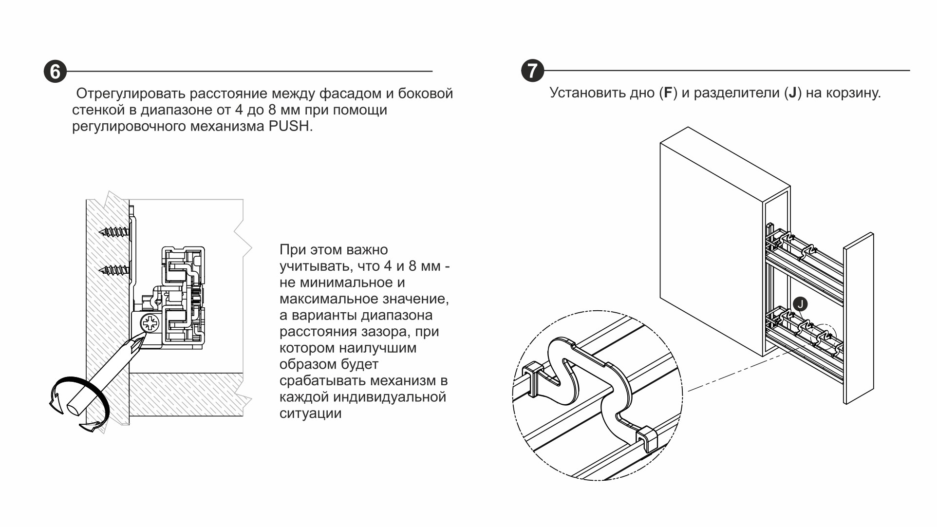 Специальный красный регулировочный винт в конструкции направляющих и риски на корпусе механизма позволят отрегулировать расстояние между фасадом и боковой стенкой мебельного короба в диапазоне от 4 до 8 мм, тем самым отрегулировать срабатывание механизма под конкретное мебельное изделие и выстроить все фасады в единую линию.