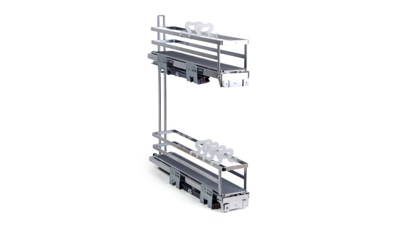 Модель обладает удобной регулировкой фасада в трёх плоскостях, стильным европейским внешним видом, плоской формой боковых прутков корзин. Сплошное дно с антискользящим покрытием и дополнительные съёмные делители FLORA гарантируют максимальную устойчивость хранимой утвари на обоих этажах. Кроме того, дно можно легко снять для чистки и мытья.