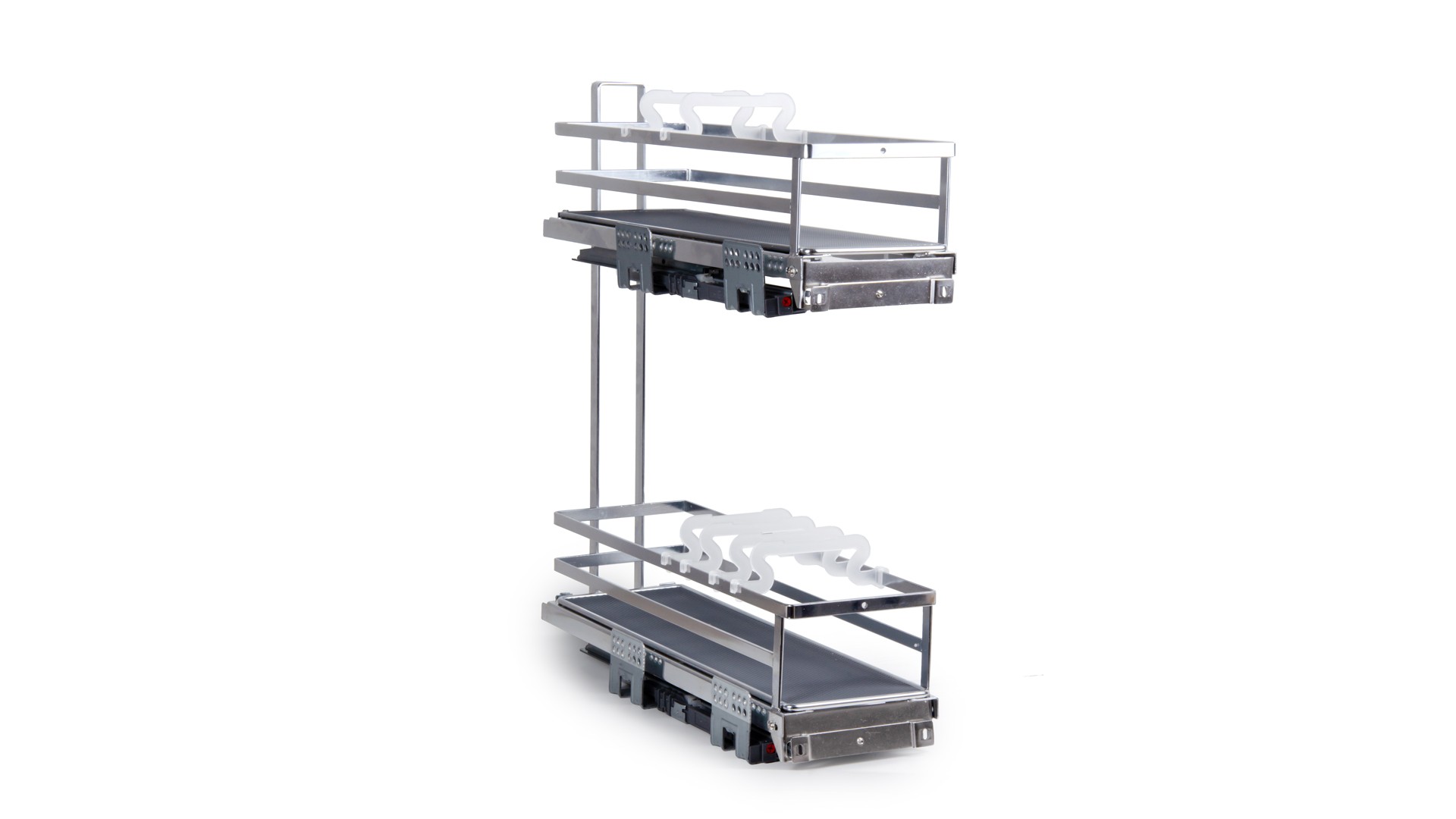 Модель обладает удобной регулировкой фасада в трёх плоскостях, стильным европейским внешним видом, плоской формой боковых прутков корзин. Сплошное дно с антискользящим покрытием и дополнительные съёмные делители ФЛОРА гарантируют максимальную устойчивость хранимой утвари на обоих этажах. Кроме того, дно можно легко снять для чистки и мытья.