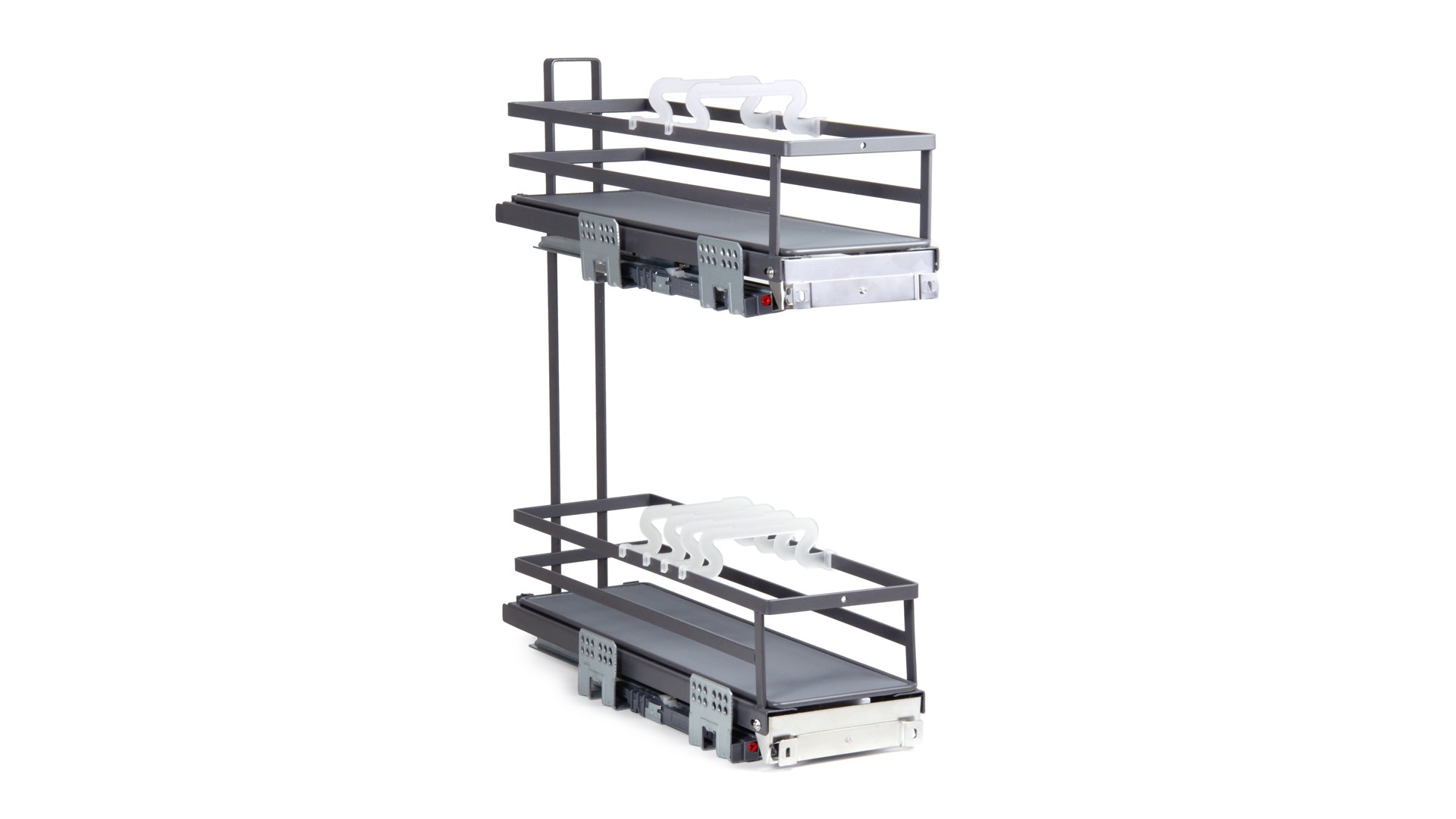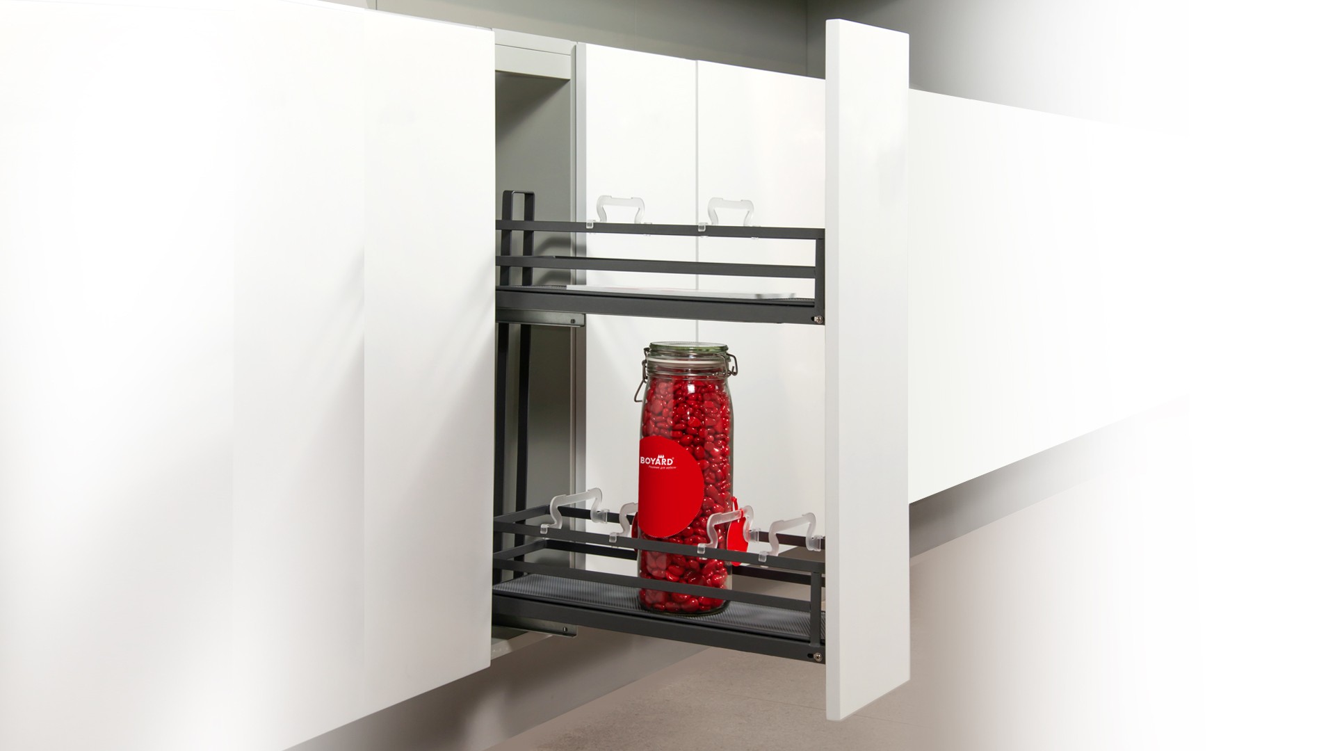 Модель обладает удобной регулировкой фасада в трёх плоскостях, стильным европейским внешним видом, плоской формой боковых прутков корзин. Сплошное дно с антискользящим покрытием и дополнительные съёмные делители FLORA гарантируют максимальную устойчивость хранимой утвари на обоих этажах. Кроме того, дно можно легко снять для чистки и мытья.