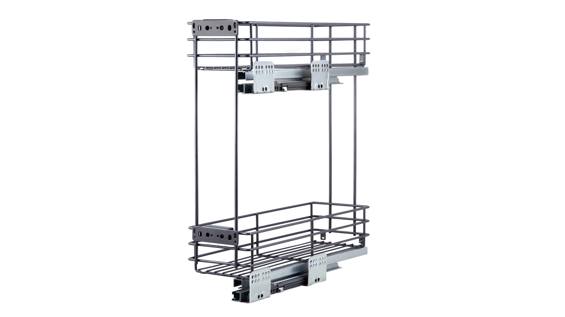 Bellissimo функционирует на направляющих скрытого монтажа полного выдвижения с амортизацией. Модель обеспечит удобный полный доступ к продуктам и жидкостям. Ассортимент Bellissimo включает четыре варианта бутылочниц для нижних баз кухонных гарнитуров: для модулей размером 150 мм и 200 мм с левым или правым расположением направляющих.