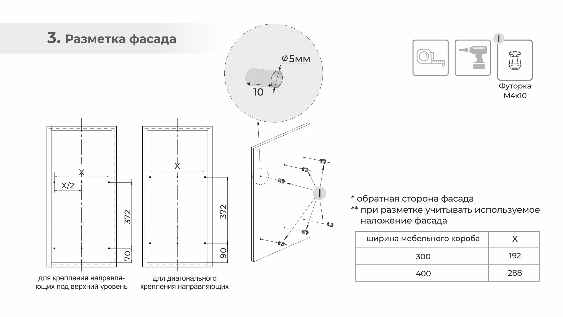 В модели X.ERGO KR44 имеется съёмный держатель фасада с 2D-регулировкой, возможна установка с рамочными фрезерованными фасадами из плитных материалов с отступом от края фасада от 45 мм. В комплект входит антискользящий коврик, что обеспечивает максимальную устойчивость хранимой утвари на обоих этажах.