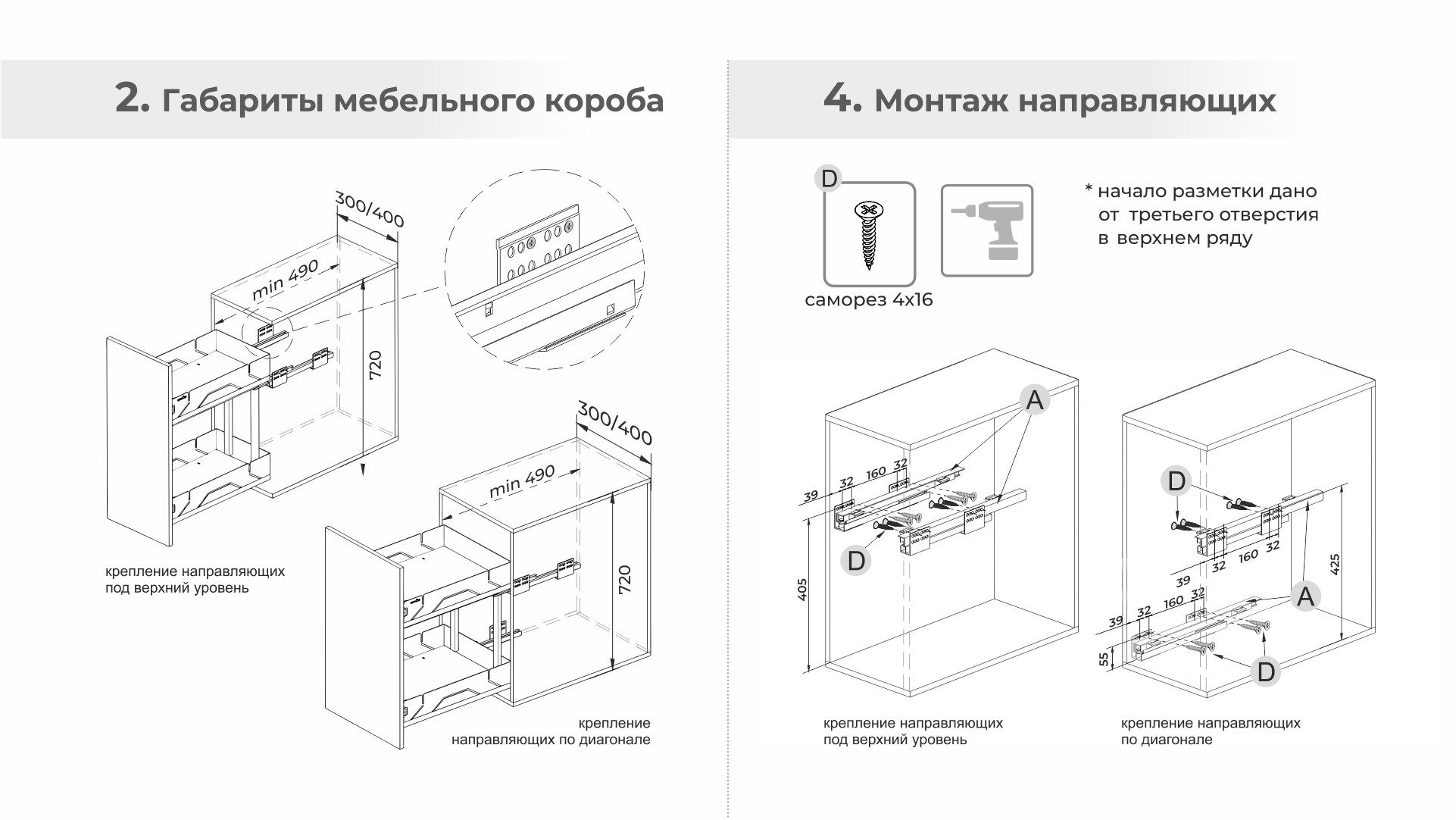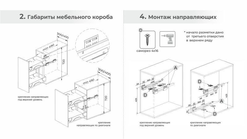 1. По диагонали — одна направляющая устанавливается в верхней части, вторая в нижней части корзины.