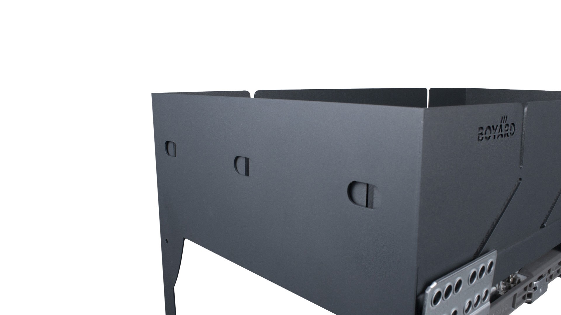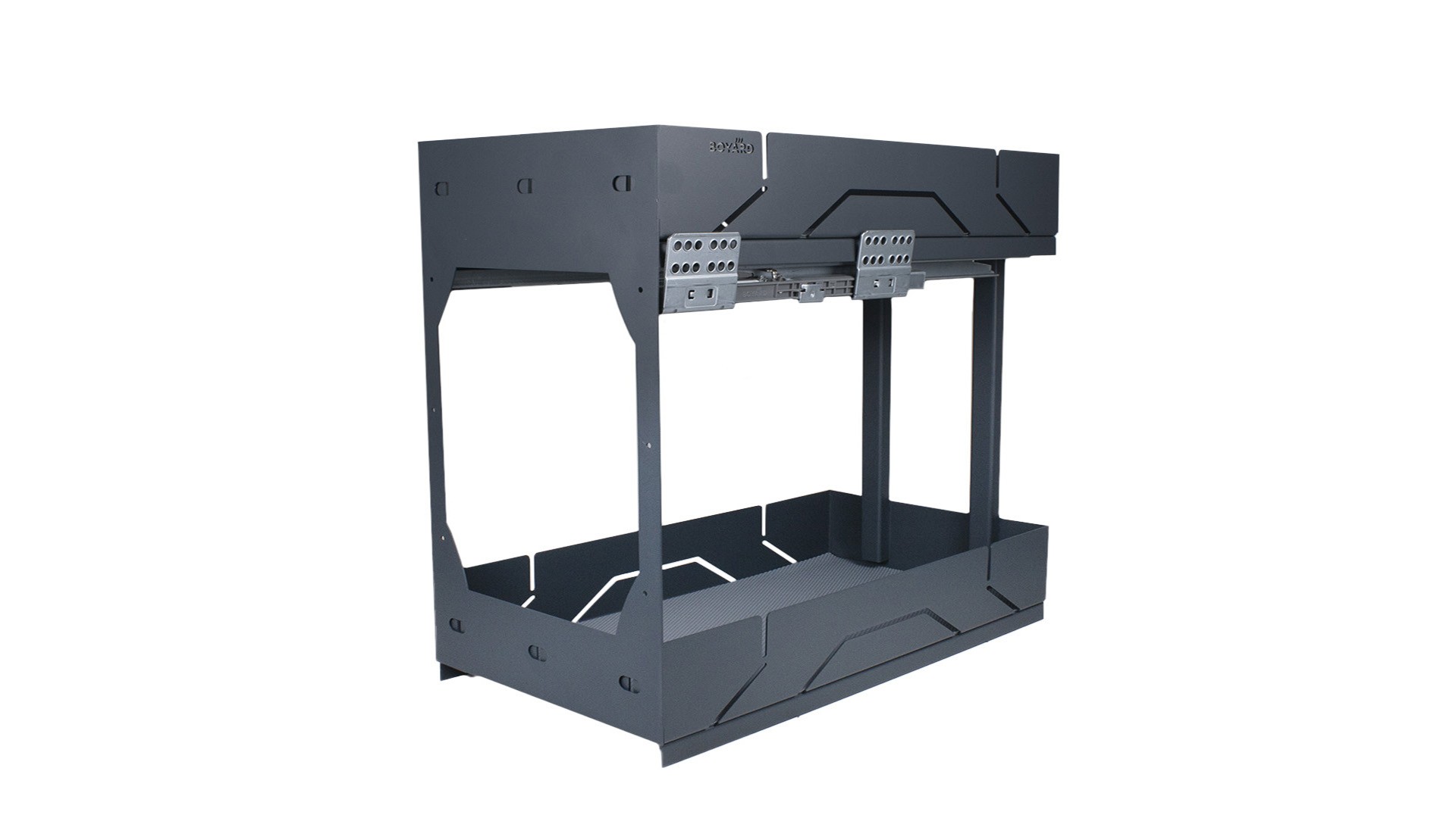 X.ERGO KR44 — стильная стальная корзина-карго с амортизацией и монобоковинами в эксклюзивном дизайне. Выполнена из листа стали толщиной 1,5 мм в порошковой покраске. Предназначена для удобного хранения ёмкостей различной высоты в мебельных модулях из плитных материалов толщиной 16 и 18 мм.