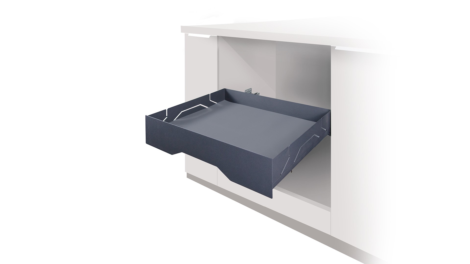 X.BOX KR45 – стальной выдвижной ящик с высоким полноценным фасадом, монобоковинами в эксклюзивном дизайне и противоскользящим ковриком.