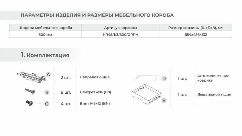 Стильный выдвижной ящик шириной 600 мм и грузоподъёмностью 30 кг выполнен из листа стали с надёжным покрытием в цвете Графит высокой степени антикоррозийной устойчивости. Высокий фасад помогает удобно выдвигать конструкцию и предотвращает выпадение содержимого из модуля при выдвижении. Благодаря наличию фасада X.BOX KR45 готов к установке сразу после покупки.