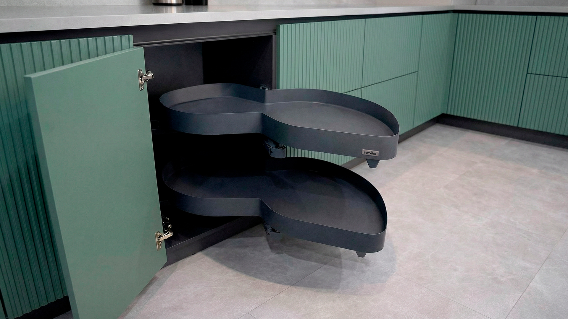 «Волшебный уголок» Lotus – это стильная и эргономичная многофункциональная корзина, предназначенная для хранения кухонной утвари: посуды, кастрюль, бытовой техники и пр. в угловых модулях размером 900-1000 мм. Модель представлена в двух вариантах: для левых и правых угловых шкафов.