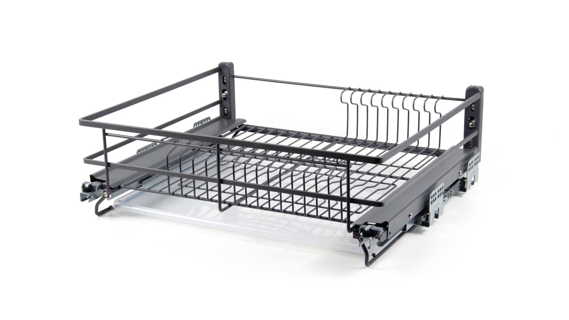 МИРА KRS06 — выдвижная корзина-сушка в эксклюзивном дизайне с плоским прутком с амортизацией, предназначена для хранения разноплановой посуды в нижней базе мебельного гарнитура.