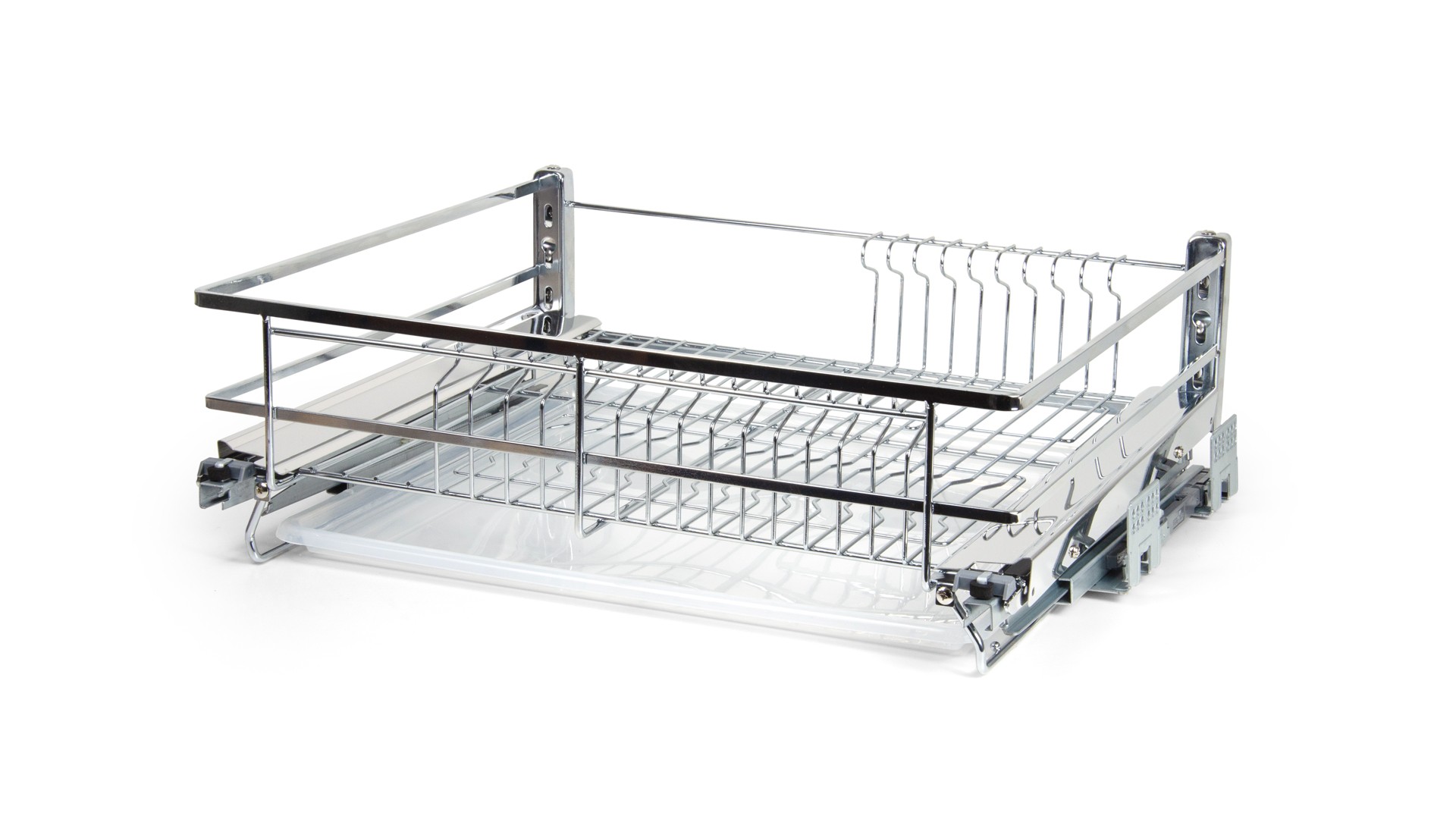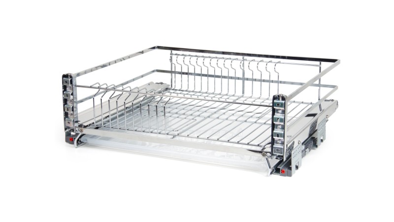 МИРА ПУШ — выдвижная корзина-сушка в эксклюзивном дизайне с плоским прутком и механизмом открывания от нажатия, предназначена для хранения разноплановой посуды в нижней базе мебельного гарнитура без ручек.