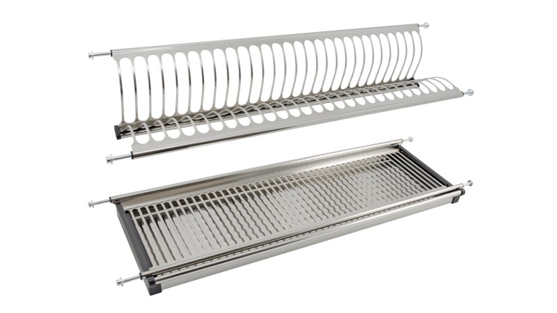 Двухуровневая сушка для посуды быстрого монтажа для современных кухонных гарнитуров позволяет размещать значительное количество вымытой посуды. Модель оснащена стальным поддоном для сбора стекающих с посуды капель воды. Одно из достоинств сушки – быстрый монтаж: конструкция монтируется в предварительно просверленные отверстия. Материал конструкции – нержавеющая сталь и пластик.