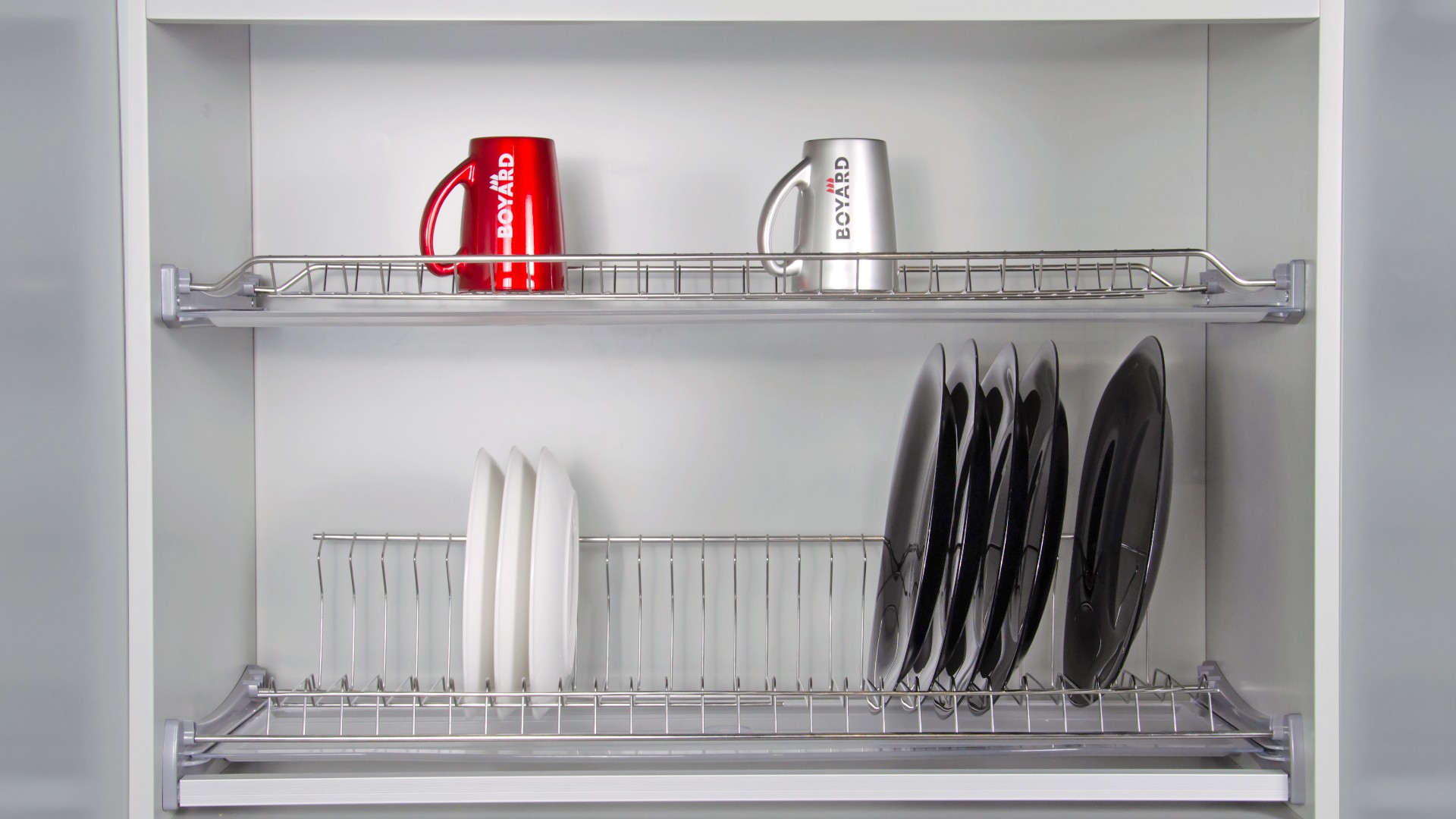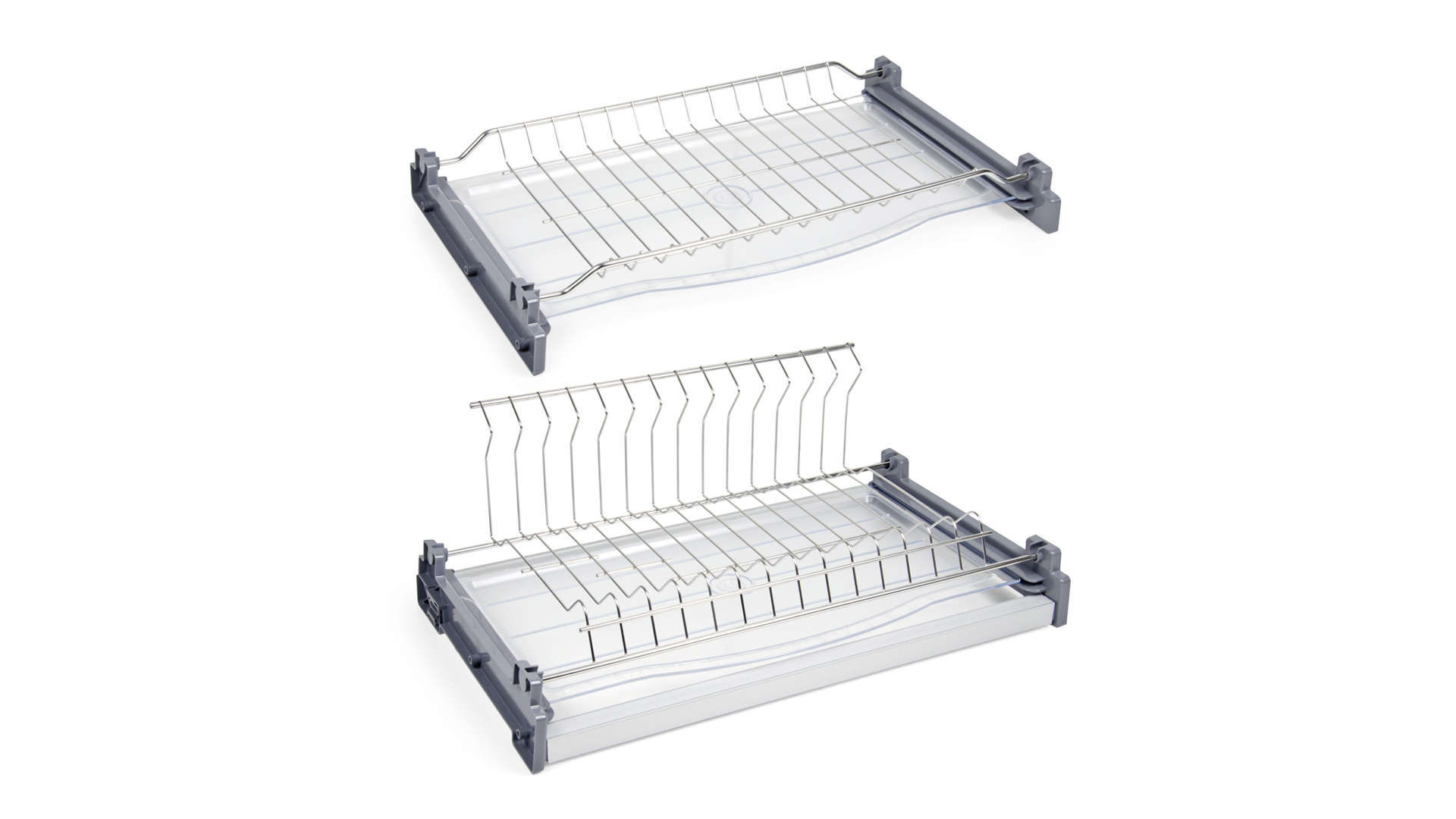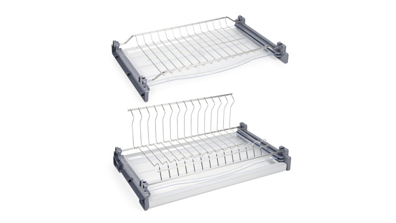 LORA SU06 — двухуровневая сушка для посуды из нержавеющей стали с нижним ярусом L-образной формы для более стабильного удержания разноформатных тарелок. Модель имеет два плотных поддона под каждым уровнем для сбора капель воды, стекающих с посуды. Нижний ярус оснащён поперечным прутком, который препятствует проваливанию маленьких блюдец.