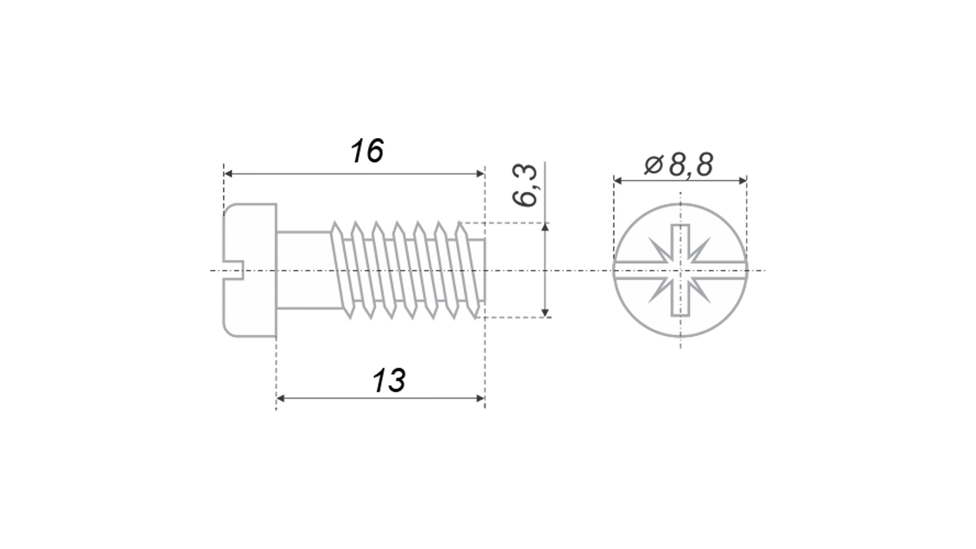 MT03/08 – евровинт 6,3*13, имеет широкий спектр применения, используется для надежного монтажа мебельных направляющих, навесов и прочей фурнитуры. Шлиц PZ.