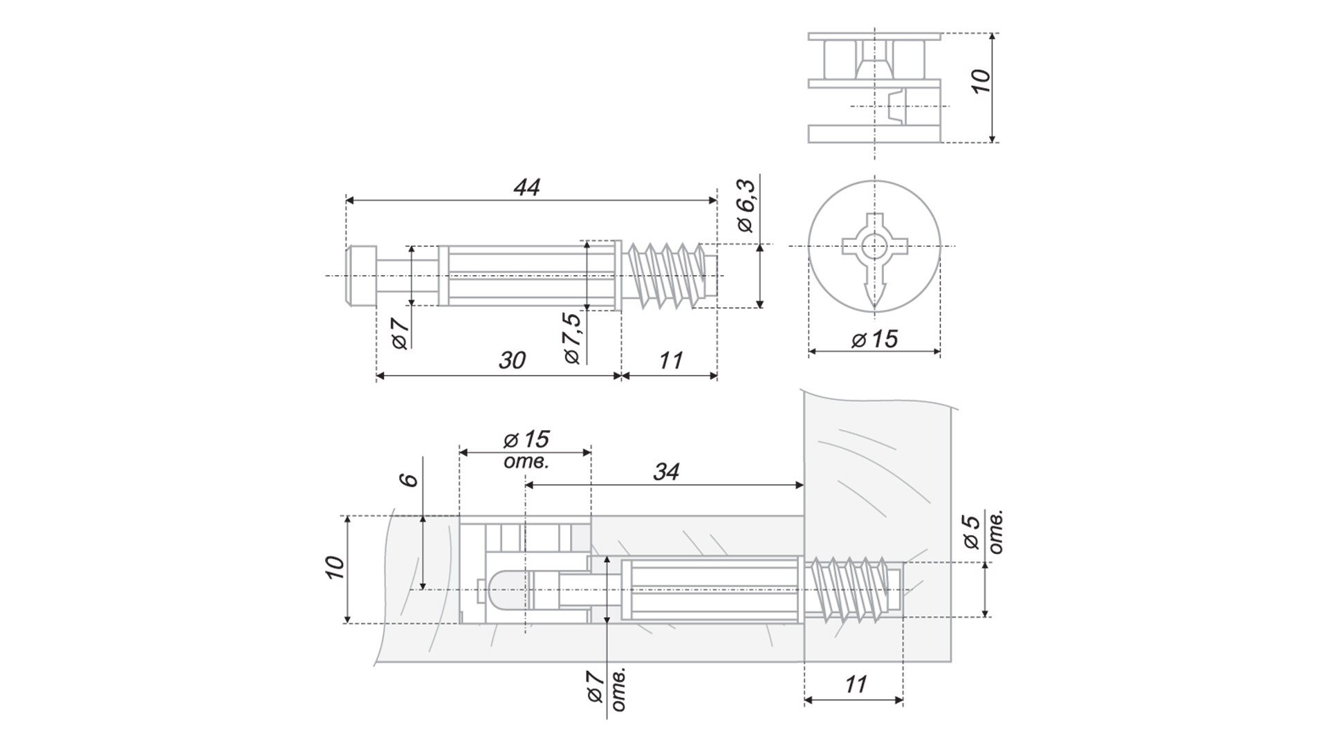 ST01/48 — эксцентриковая стяжка диаметром 15 мм и высотой 10 мм, расстояние до центра сверления под эксцентрик – 34 мм. Подходит для соединения деталей из плит толщиной от 12 мм.