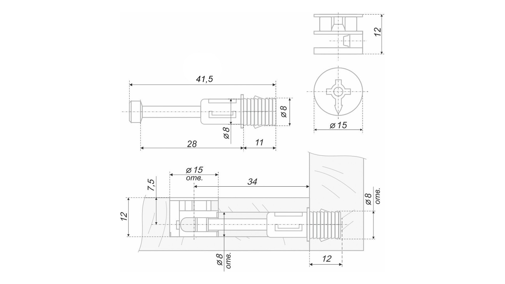 Монтаж осуществляется легко и быстро: дюбель легко вставляется в заранее просверленное отверстие, при затягивании эксцентрика распорная часть изпрочного пластика расширяется, обеспечивая надёжную фиксацию элементов.