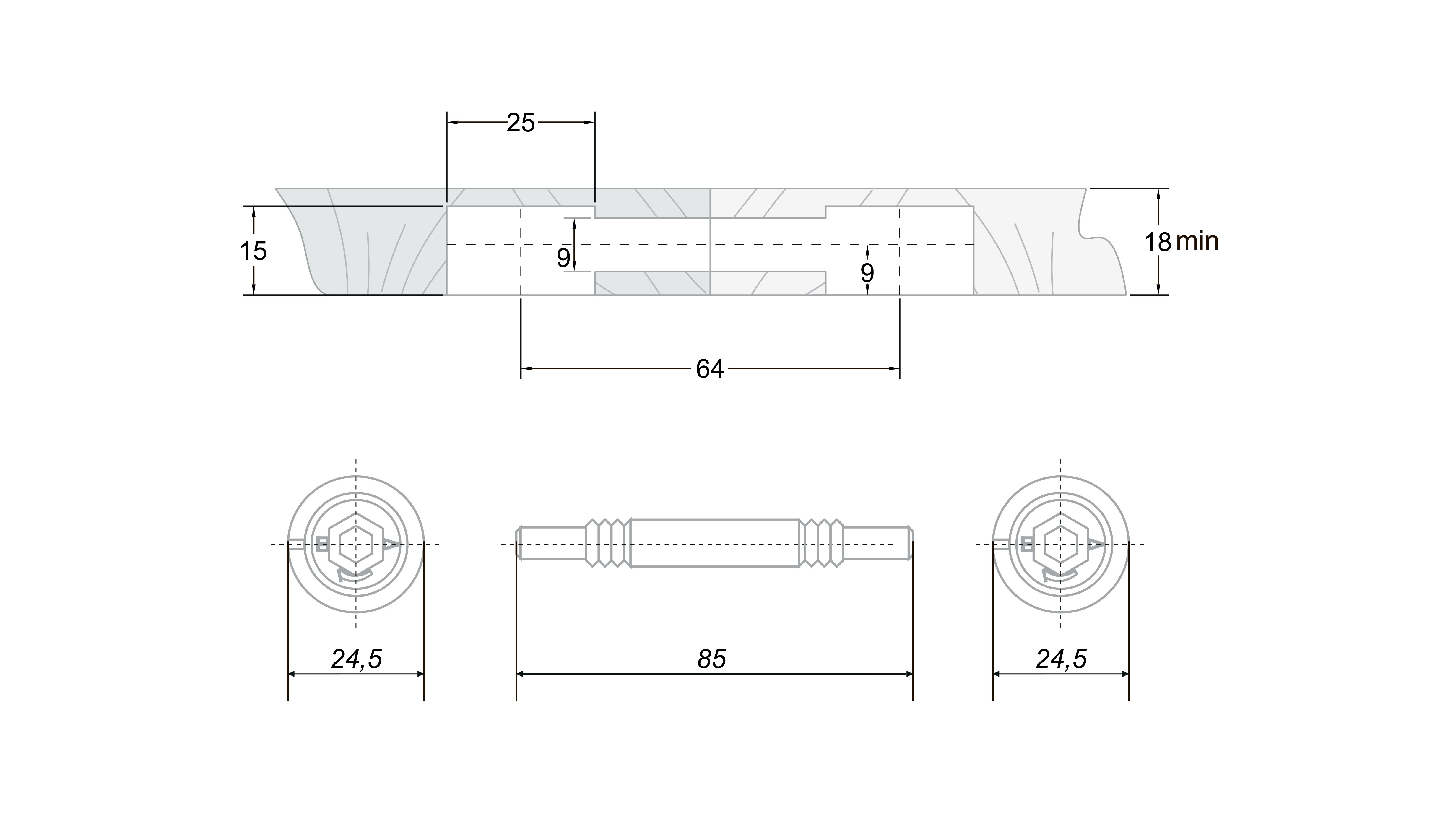 При монтаже встык — не требуется фрезеровки пазов для дюбеля: в рамках установки стяжки, в столешнице достаточно подготовить посадочные места для эксцентриков и реализовать сквозное отверстие для дюбеля.