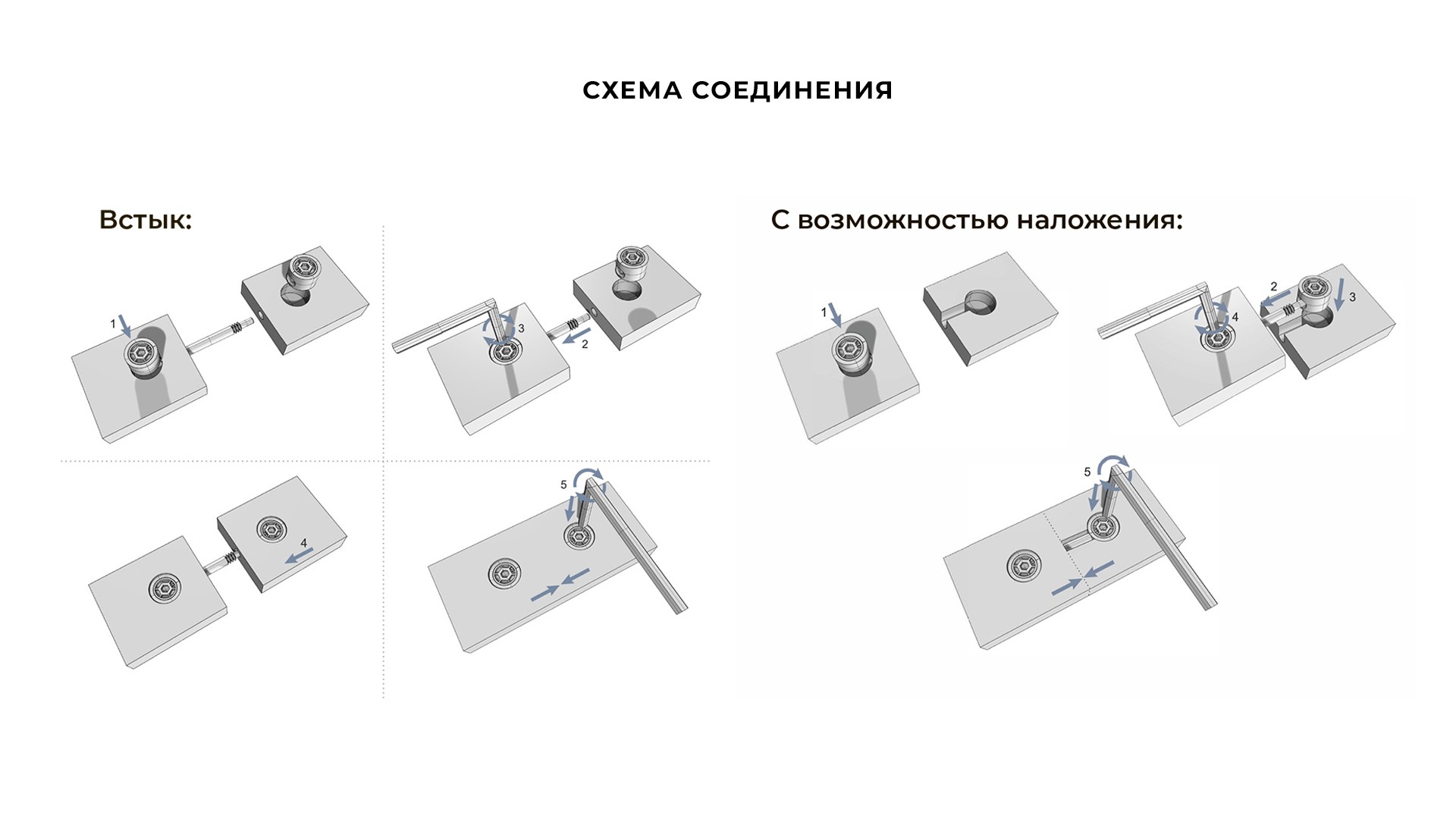 При монтаже наложением — сверление паза для дюбеля происходит только в одной из частей столешницы. Данный способ полезен при соединении плит в ограниченном пространстве.