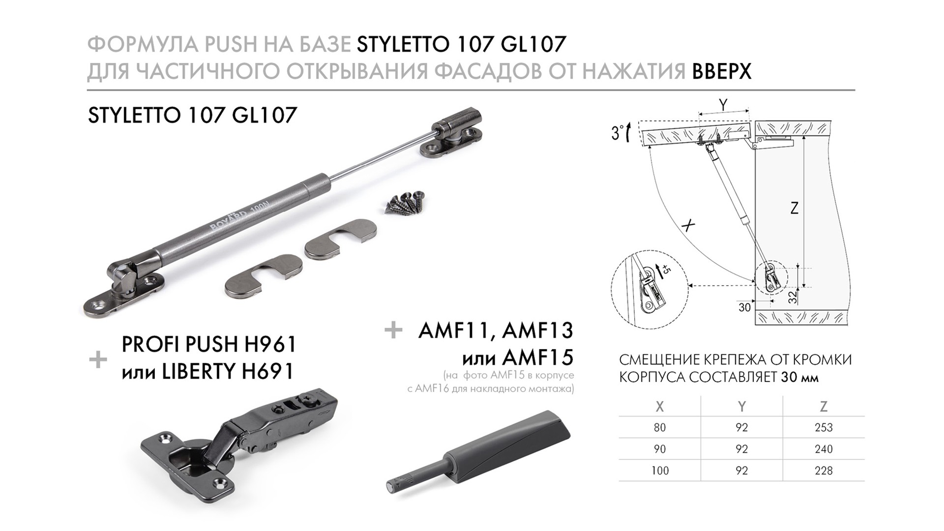 GL107 рекомендуется устанавливать в комбинации с петлями BOYARD без амортизатора или петлями свободного хода. Возможна установка совместно с толкателями AMF для открывания фасадов от нажатия, подойдут варианты AMF10-15. Глубина установки при этом меняется с 16 до 30 мм. Эти изменения отражены в схеме в карусели фото карточки.