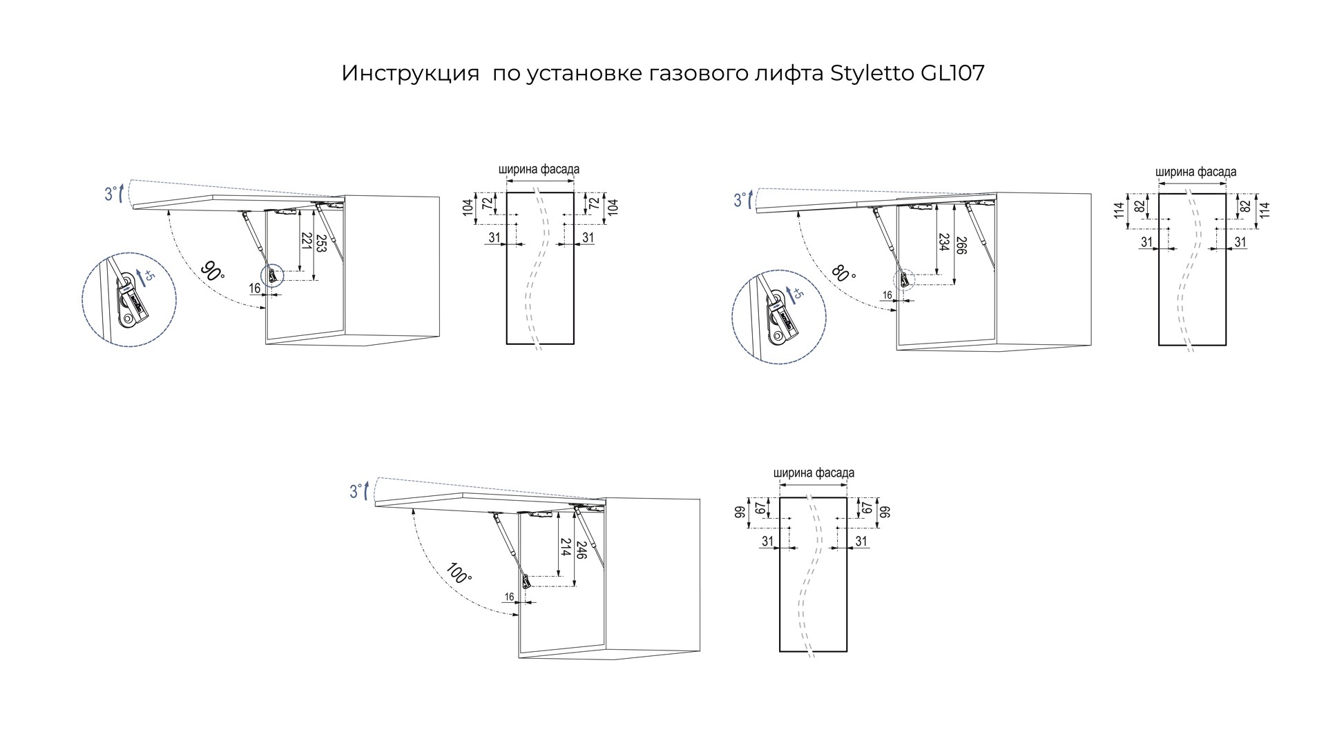 За счёт фрикционного механизма GL107 обеспечит фиксацию фасада в любой точке траектории движения. Регулировка угла открывания в диапазоне до 3° позволит выровнять фасад в открытом положении со смежными.