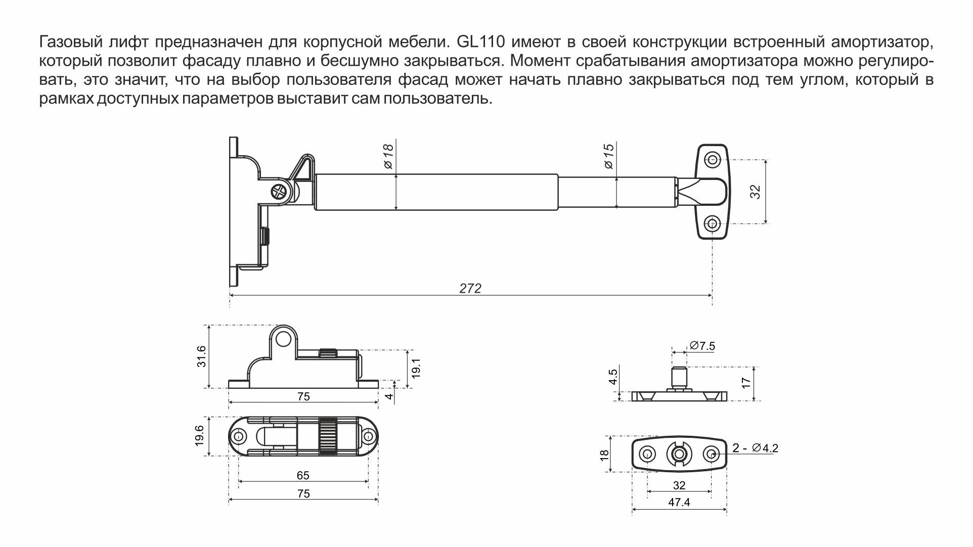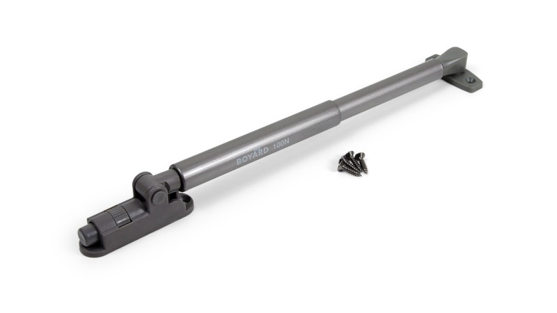 OZON GL110 — газовый лифт для фрикционного открывания фасада вверх, оснащён встроенным амортизатором для плавного и бесшумного закрывания с удобного угла, который возможно настроить под себя.