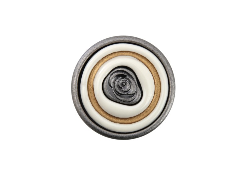 С металлом в состаренных покрытиях сочетается керамическая вставка, украшенная розой. Ручка напоминает произведение искусства – старинную камею, изящное изделие для украшения интерьера. Это не просто ручки для открывания фасада – это детали декора, создающего облик мебели.