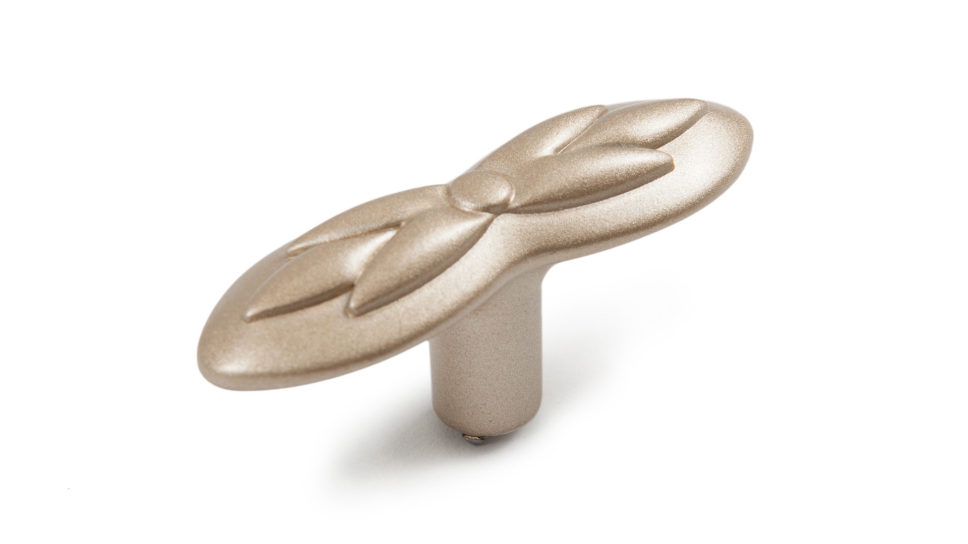 Ручка с растительным рисунком будет хороша на натуральных древесных фасадах или фасадах в покрытии с фактурой дерева, на мебели с фрезеровкой и даже патиной.