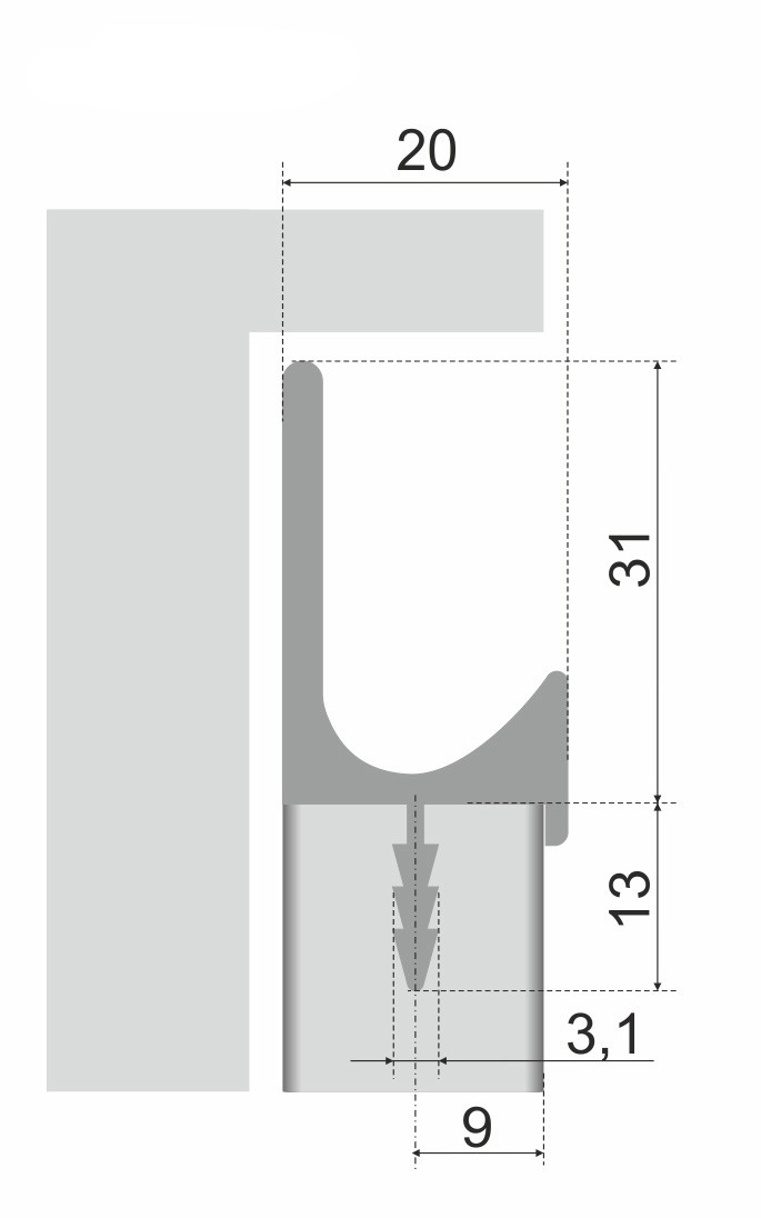 L-Лайн RP003 — алюминиевая профильная ручка L-образной формы, которая врезается в заранее подготовленный паз в торце фасада толщиной до 18 мм. Ручки реализуются в размере 3000 мм и подгоняются под ширину фасада.