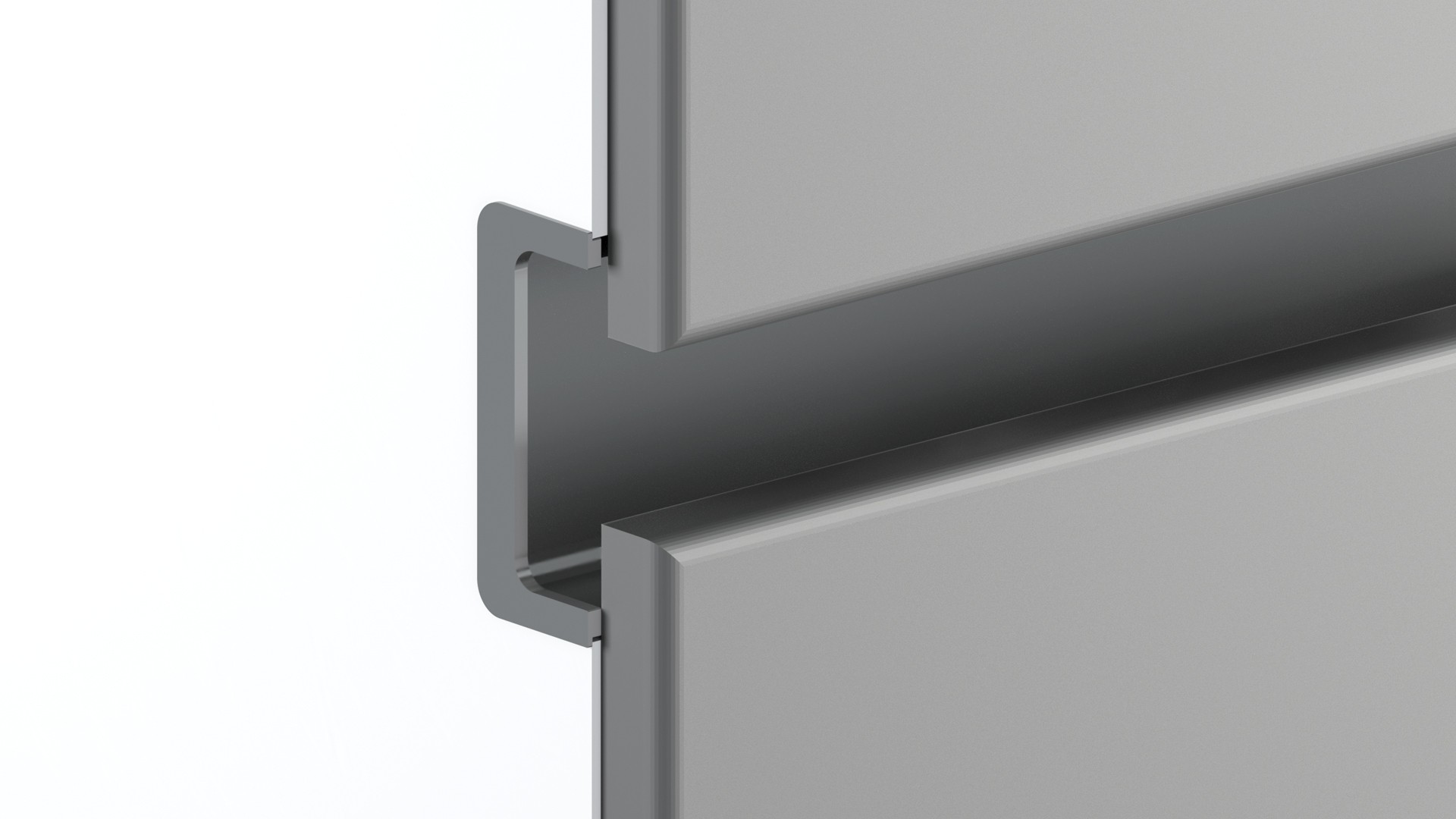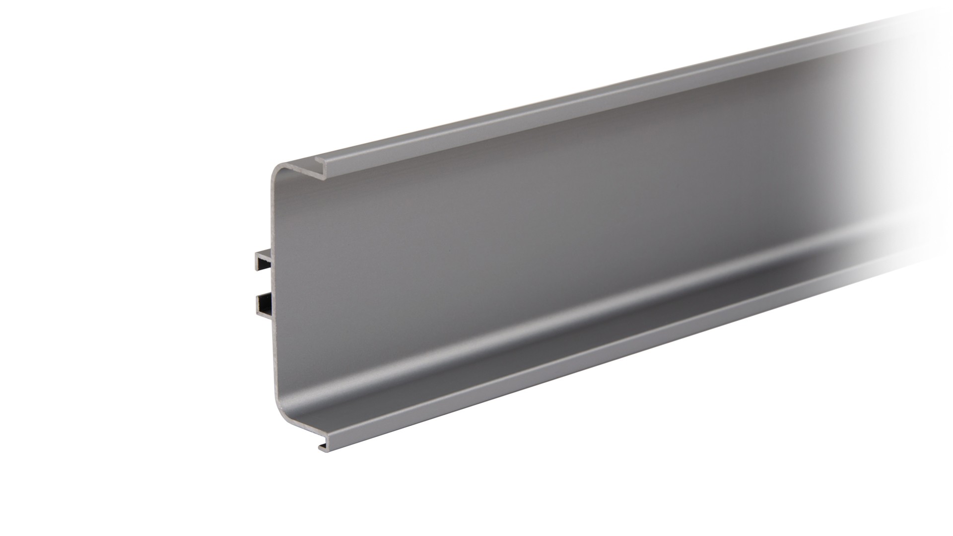 RP050 — C-образный профиль ГОЛА БАЛАНС для фасадов второго и следующих рядов нижней базы мебельного гарнитура. Модель устанавливается между ящиками и позволяет захватывать как нижний, так и верхний фасады. Полезная длина RP050 составляет 4100 мм.