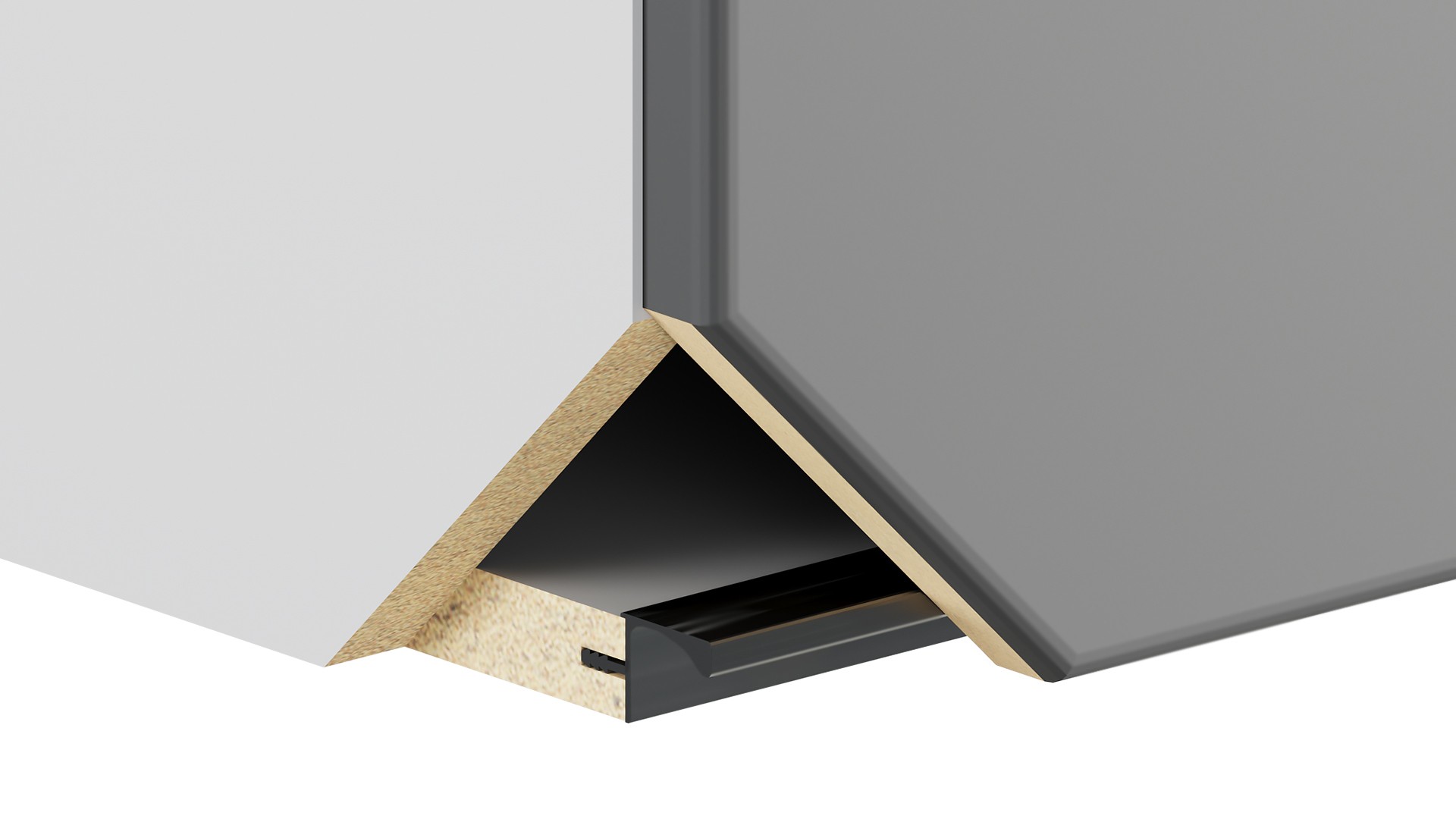RP052 — профиль ГОЛА БАЛАНС для верхних баз мебельного гарнитура. Для установки ручки-профиля необходимо профрезеровать торец дна навесных модулей. Установленная ручка создаёт выемку для удобного захвата и открывания фасада рукой.