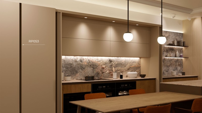 RP053 устанавливается по центру между двумя вертикальными распашными фасадами, обеспечивая доступ к обоим одновременно. Модель станет отличным решением для минималистичных гарнитуров для кухонь, спален, гостиных и прихожих.