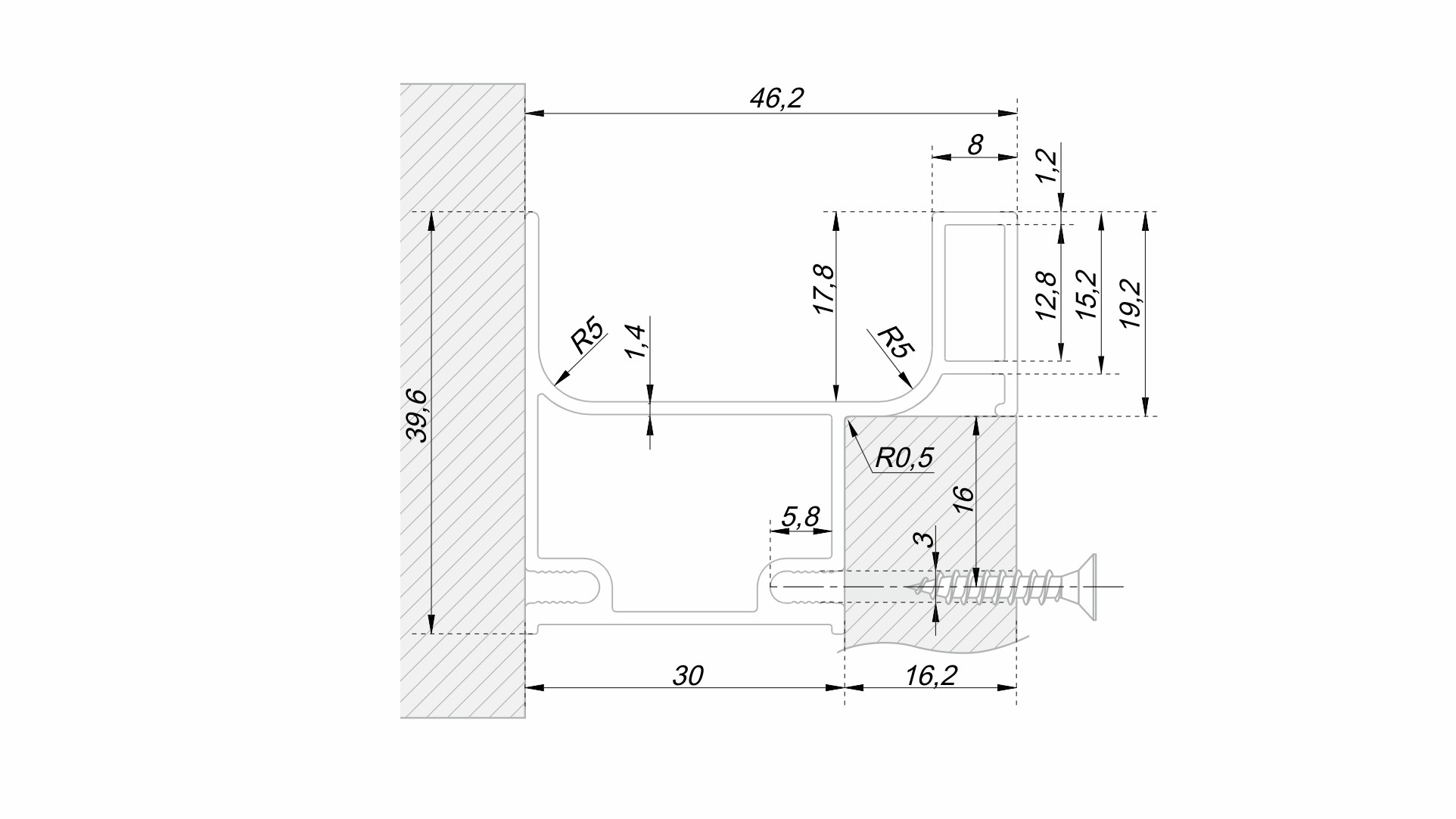 RP054 имеет увеличенную на 100 мм фактическую длину — 3000 мм. Технологический запас 100 мм учитывается при транспортировке и монтаже, защищая профиль GOLA BALANCE от внешних воздействий и обеспечивает качественный внешний вид по всей полезной длине профиля. Перед монтажом на корпус мебели технологичный запас необходимо спиливать под прямым углом торцовочными пилами (или на станках) с установленными дисками для резки алюминиевого профиля.