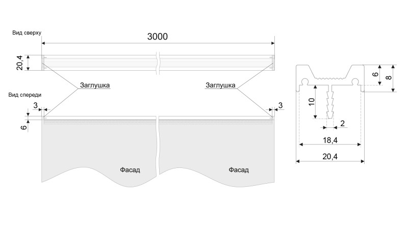 Для того чтобы профильная ручка совместно с заглушками не выходила за плоскость фасада справа и слева необходимо при расчёте длины ручки учесть место под заглушки — 3 мм с каждой стороны. В противном случае заглушки будут выступать с обеих сторон от кромки фасада на 3 мм.
