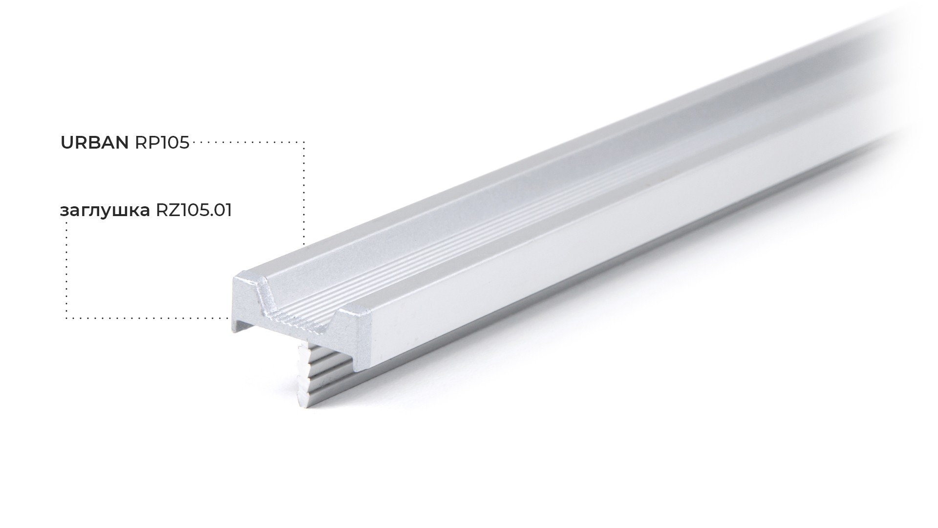 URBAN RP105 — алюминиевая профильная ручка с интегрированными пазами для установки заглушек, которые закрывают торцы модели. Паз для заглушек проходит по всей длине ручки, поэтому не важно, в какой части она будет обрезана под размер фасада. URBAN RP105 имеет специальный «гребешок» и врезается в заранее подготовленное отверстие в торце фасада.