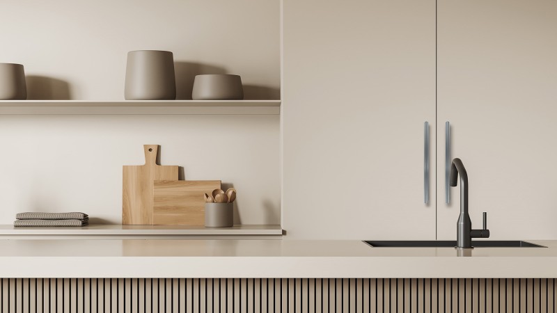 Ручка представлена как в небольших размерах от 128 мм, так и в форм-факторе 960 мм. SHELL RS064 можно устанавливать не только вертикально, но и горизонтально — для завершённого образа мебельного гарнитура.