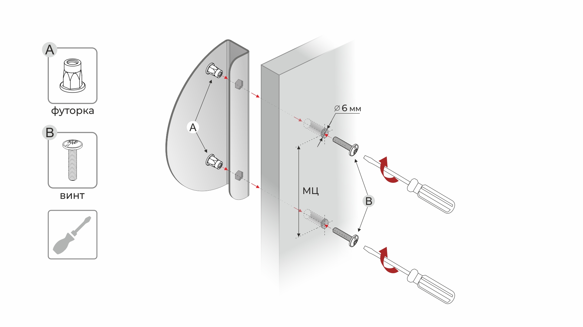 В комплект с ручкой входит крепёж 4*18 мм, который оптимально подходит для установки на фасады толщиной от 16 до 22 мм. При установке на более толстые фасады необходимо самостоятельно подобрать крепёжные винты. Ручка с предварительно установленными футорками монтируется в заранее заготовленные отверстия (d=6 mm) и прикручивается винтом с задней стороны фасада.