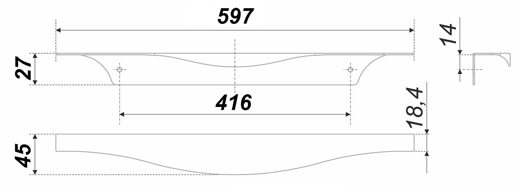 Ширина фасадов 400, 450, 500, 600, 800 – самые распространенные в массовом секторе мебели. Именно с такими параметрами предложены торцевые ручки M «в размер» фасада. Устанавливается врезным способом и крепится с обратной стороны фасада