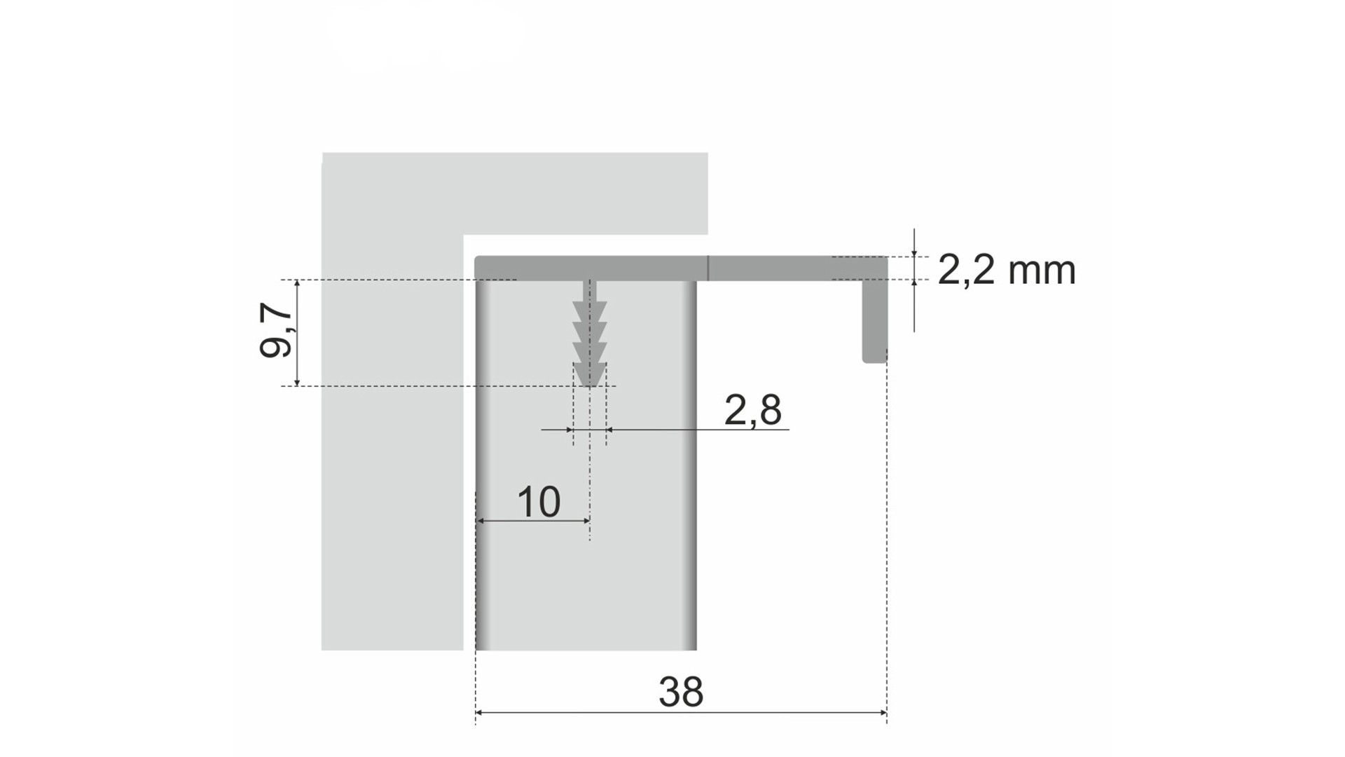 RT009 подходит для установки на фасады толщиной до 18 мм. Для установки необходимо профрезеровать паз в торце фасада.