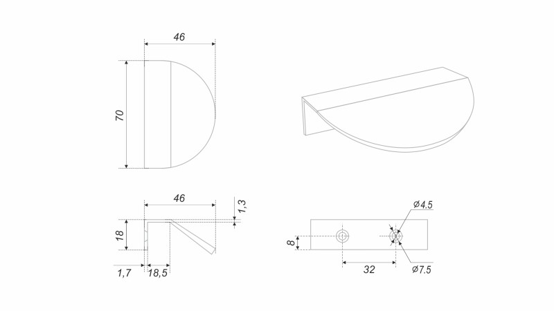 VIVA RT012 — торцевая ручка из алюминия, с геометричным выступом в форме полукруга. Для удобства захвата на ручках увеличен отступ язычка, а на его внутренней стороне предусмотрено рифление. Устанавливается наложением, подходит для фасадов толщиной до 18 мм.