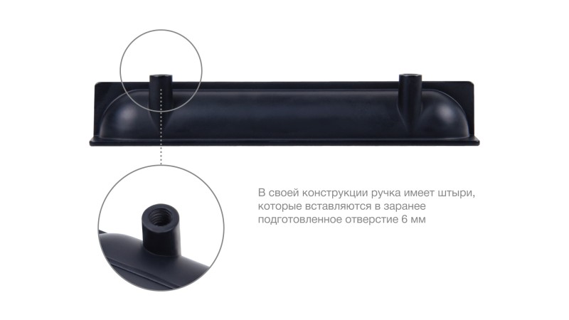 Конструкция модели имеет специальные штыри, которые вставляются в заранее подготовленное отверстие в торце фасаде на его внутренней стороне с размером 6 мм. Для надёжной фиксации ручки с фасадом применяется клей (приобретается отдельно в специализированных магазинах в зависимости от материала фасада).