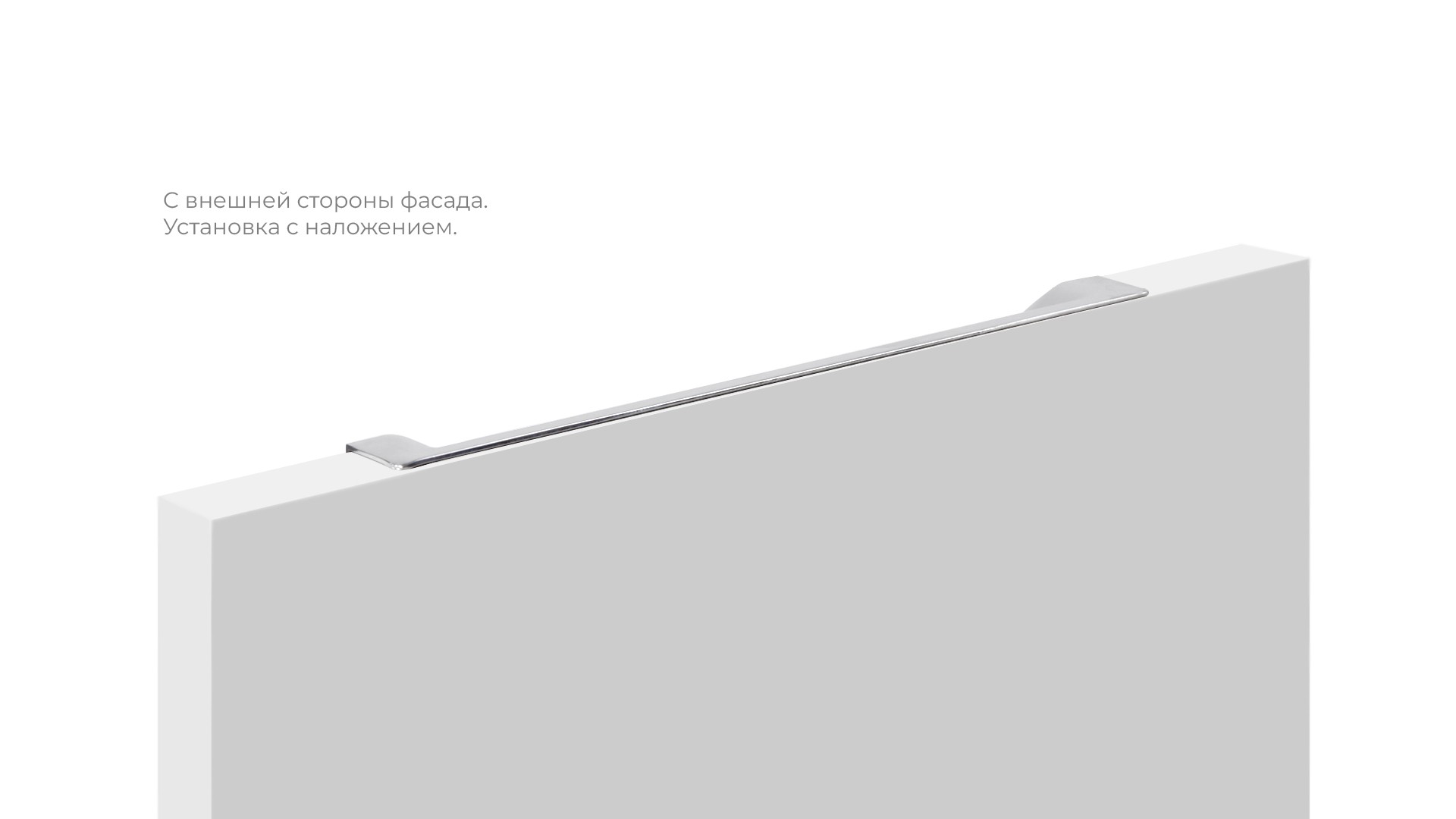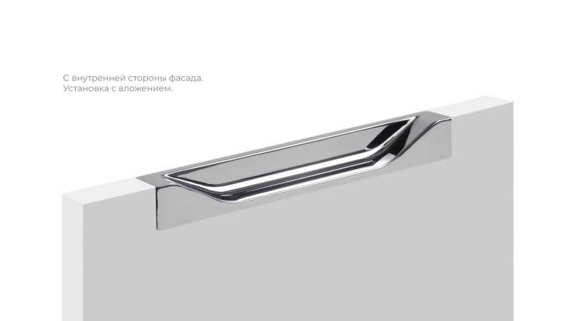 Монтаж ADAM RT021 возможен в нескольких вариантах: наложением на фасад с выступом на 1,5 мм от поверхности фасада, либо вложением в фасад чётко вровень с его уровнем. Для надёжной фиксации ручки с фасадом применяется клей (приобретается отдельно в специализированных магазинах в зависимости от материала фасада).