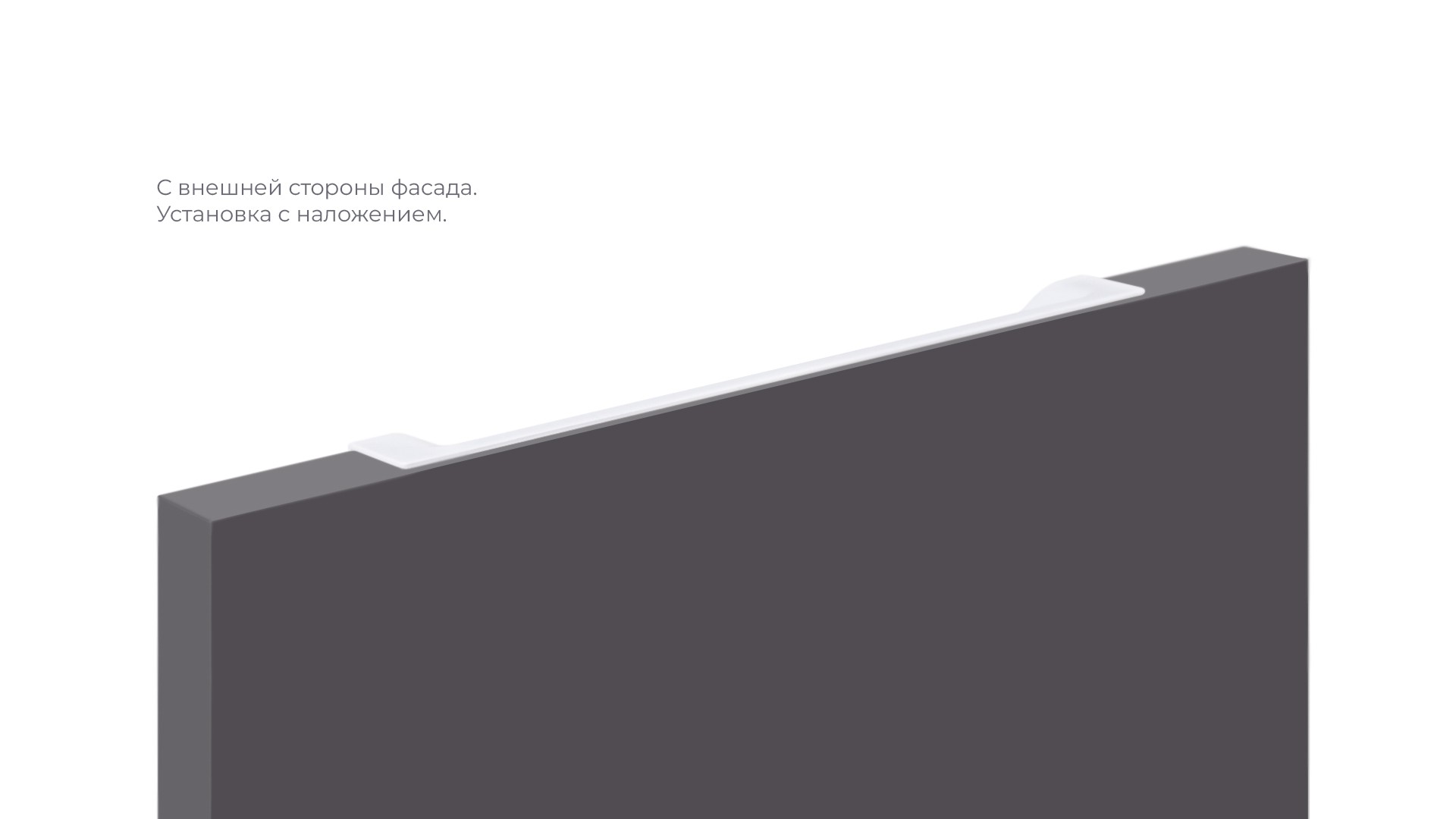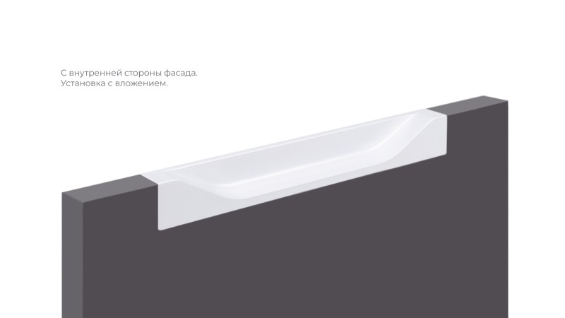Монтаж ADAM RT021 возможен в нескольких вариантах: наложением на фасад с выступом на 1,5 мм от поверхности фасада, либо вложением в фасад чётко вровень с его уровнем. Для надёжной фиксации ручки с фасадом применяется клей (приобретается отдельно в специализированных магазинах в зависимости от материала фасада).