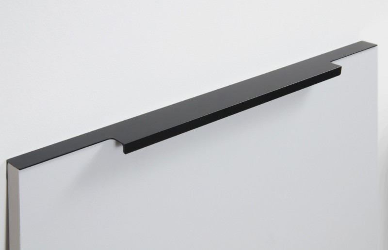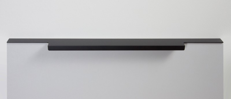 Ручка имеет богатую палитру цветовых решений и разнообразие длин. В зависимости от длины, модель допускает размещение двумя способами — «в размер» фасада и по центру широких фасадов (как большой «язычок»).