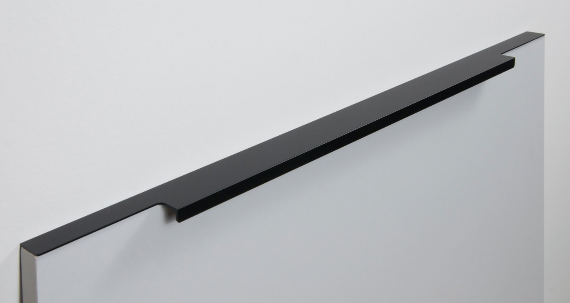 Ручка имеет богатую палитру цветовых решений и разнообразие длин. В зависимости от длины, модель допускает размещение двумя способами — «в размер» фасада и по центру широких фасадов (как большой «язычок»).