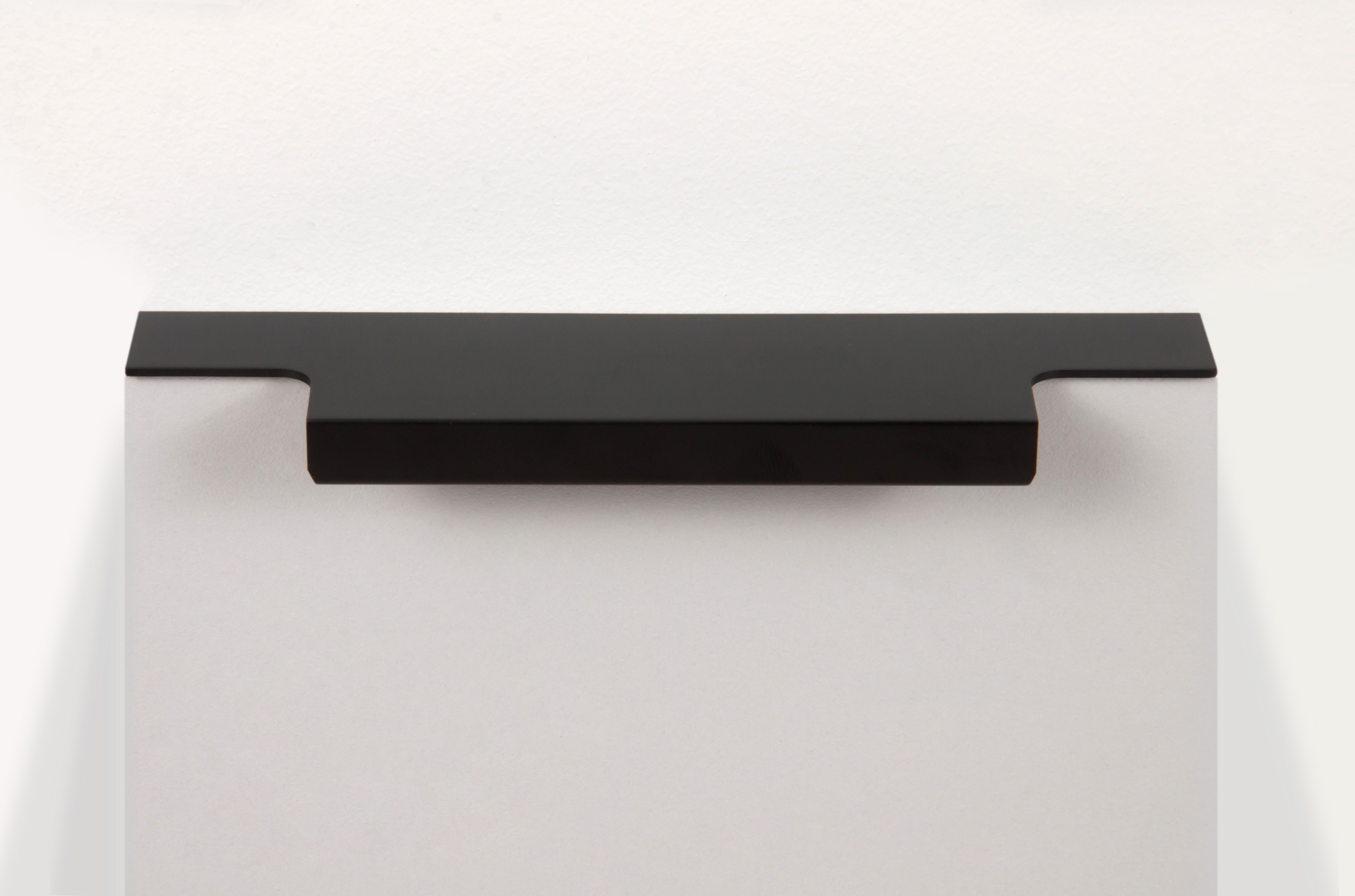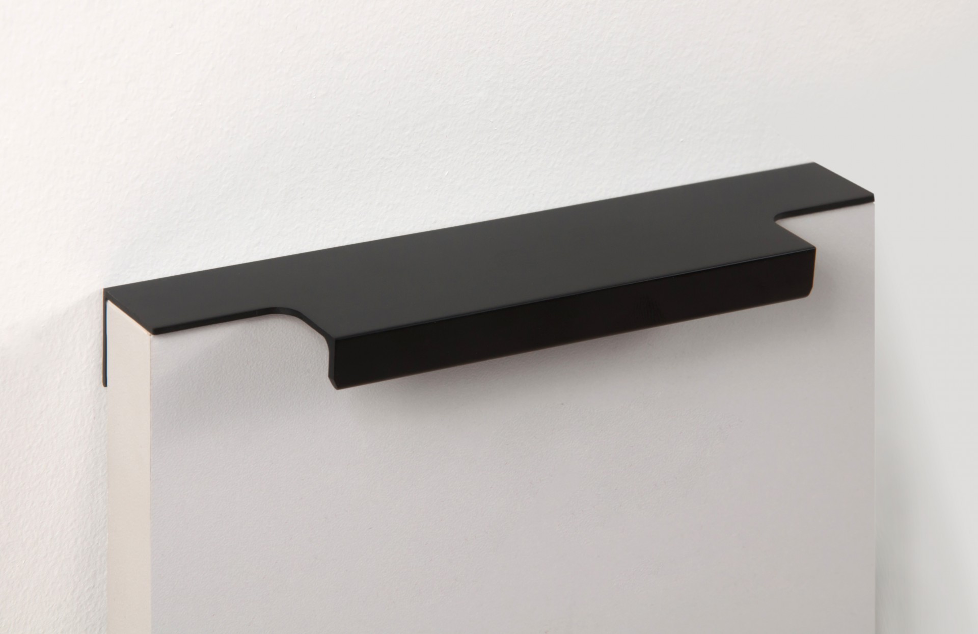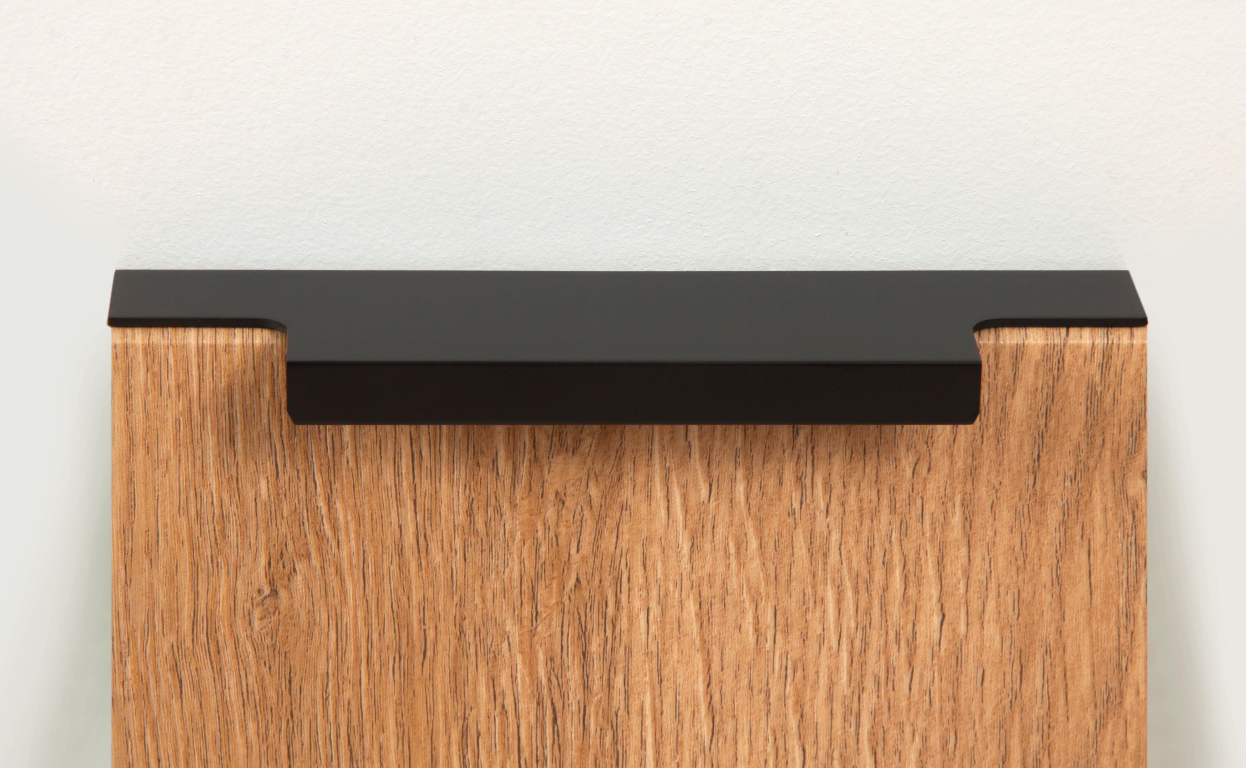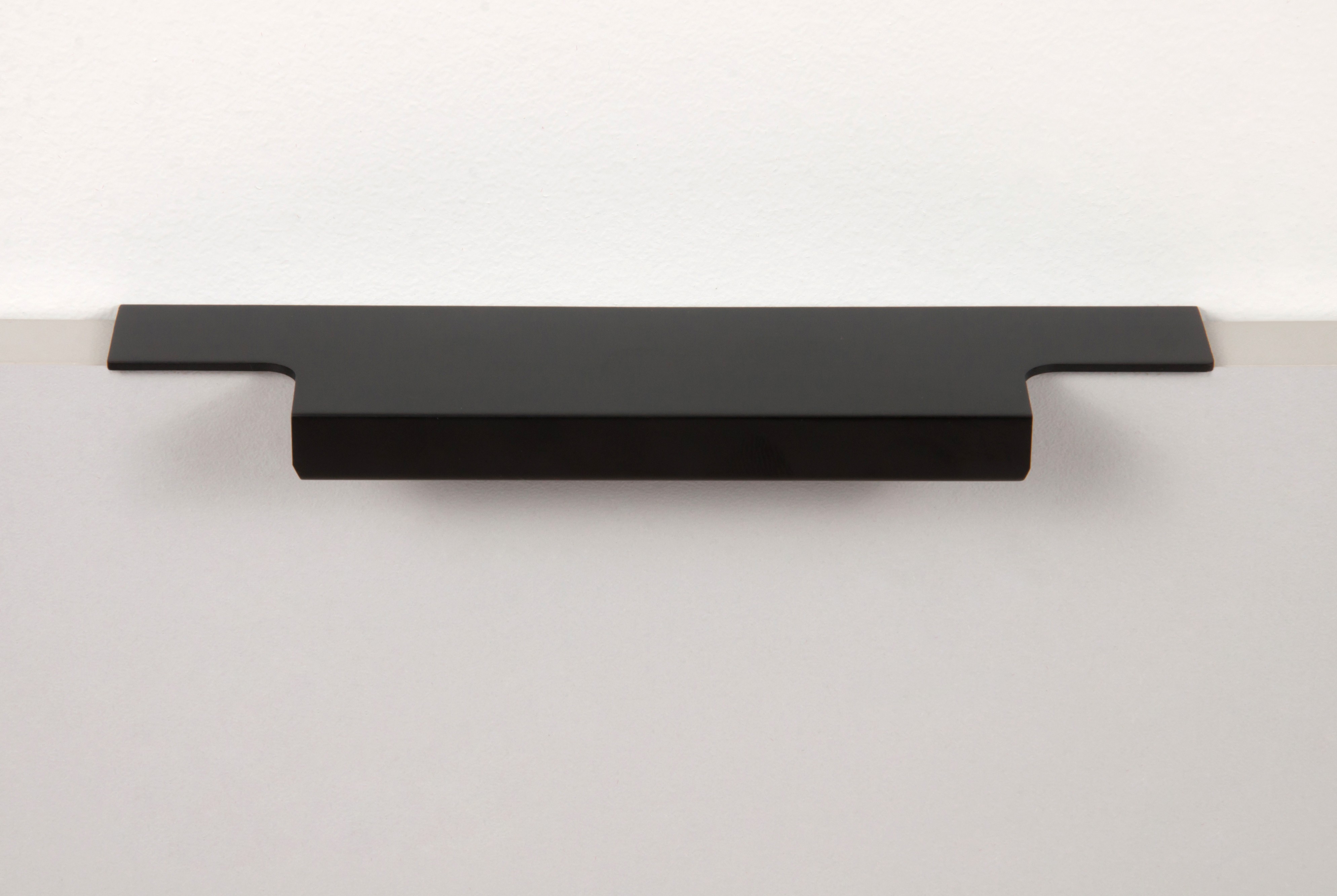Ручка имеет богатую палитру цветовых решений и разнообразие длин. В зависимости от длины, модель допускает размещение двумя способами — «в размер» фасада и по центру широких фасадов (как большой «язычок»).