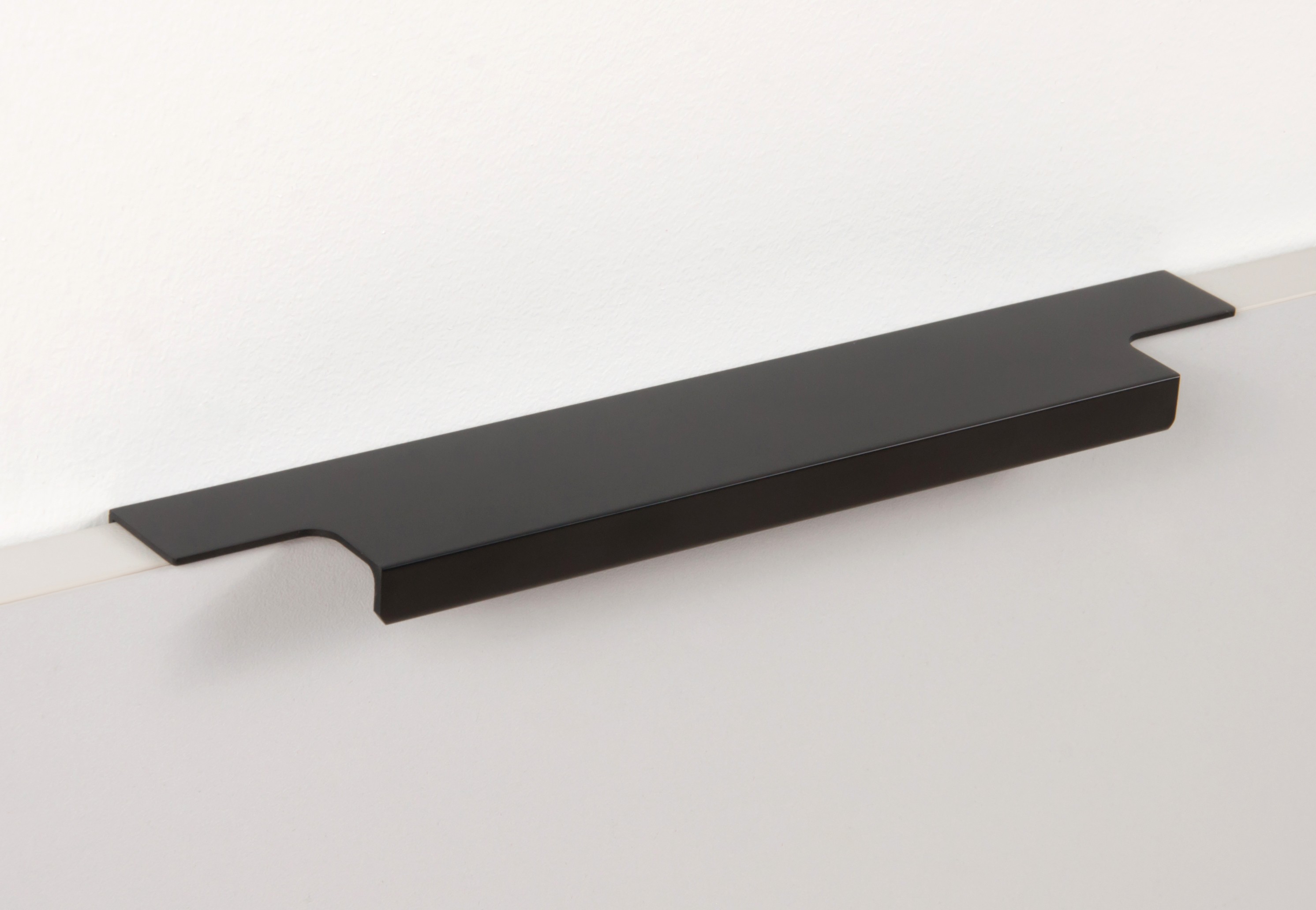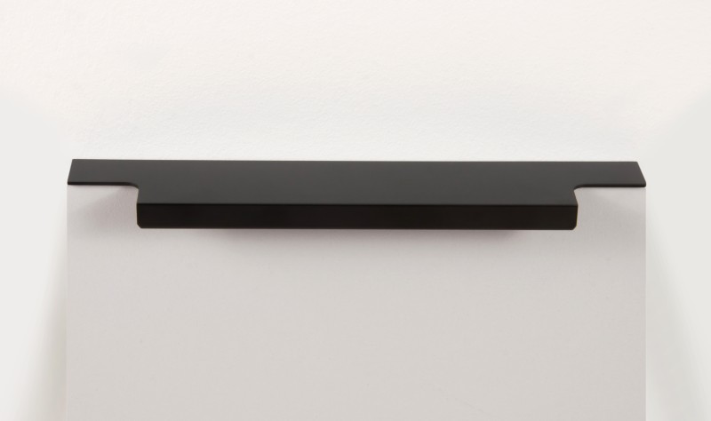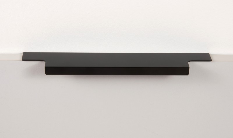 Ручка имеет богатую палитру цветовых решений и разнообразие длин. В зависимости от длины, модель допускает размещение двумя способами — «в размер» фасада и по центру широких фасадов (как большой «язычок»).