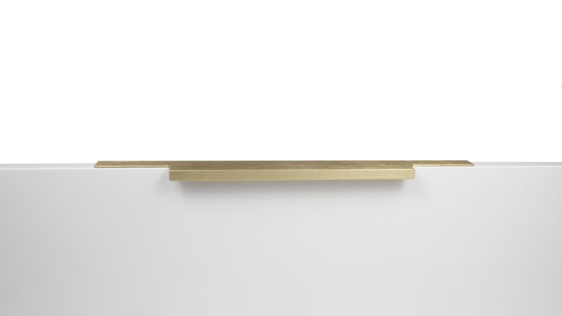 Ручка имеет богатую палитру цветовых решений и разнообразие длин. В зависимости от длины, модель допускает размещение двумя способами — «в размер» фасада и по центру широких фасадов (как большой «язычок»).