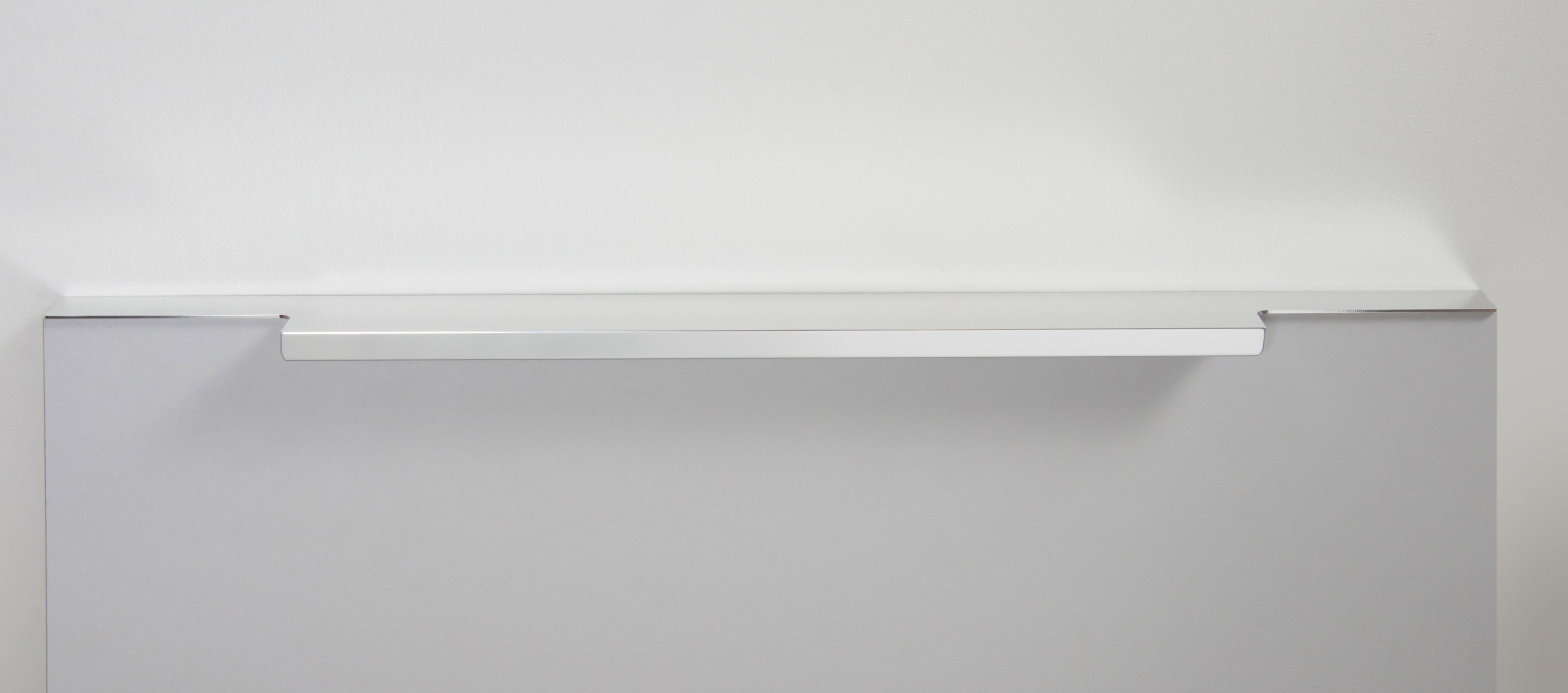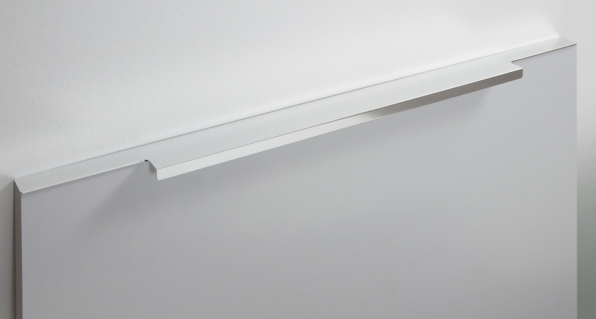 Ручка имеет богатую палитру цветовых решений и разнообразие длин. В зависимости от длины, модель допускает размещение двумя способами — «в размер» фасада и по центру широких фасадов (как большой «язычок»).