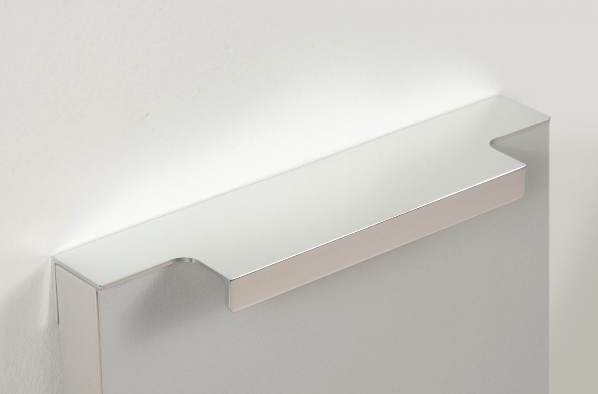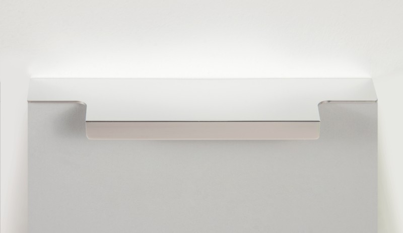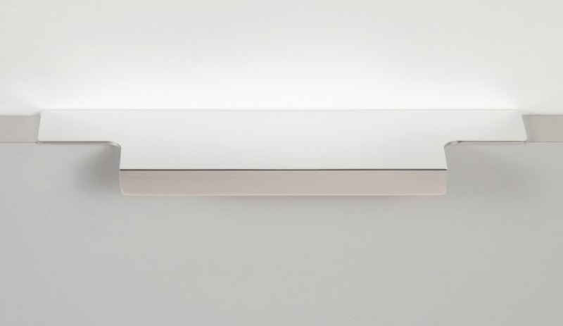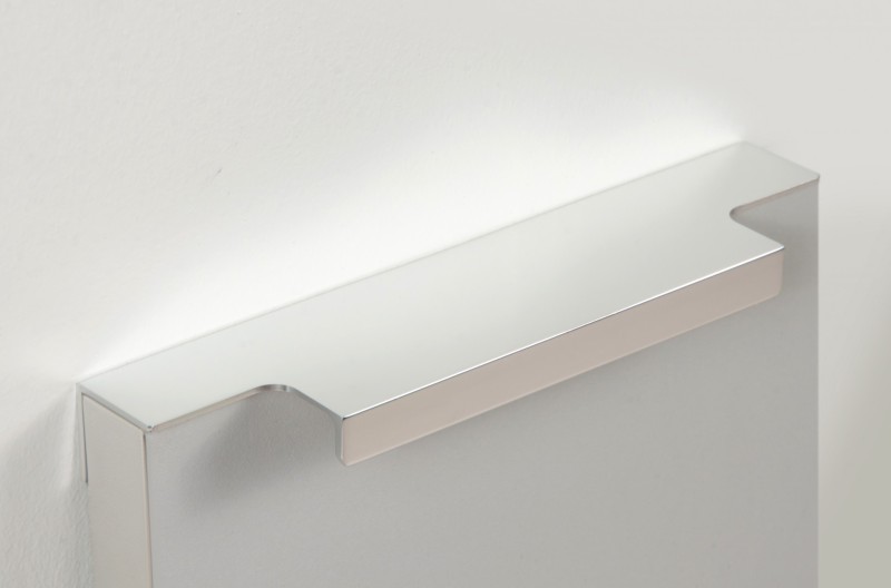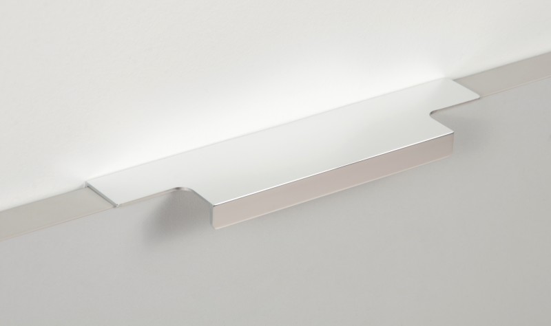 Ручка имеет богатую палитру цветовых решений и разнообразие длин. В зависимости от длины, модель допускает размещение двумя способами — «в размер» фасада и по центру широких фасадов (как большой «язычок»).