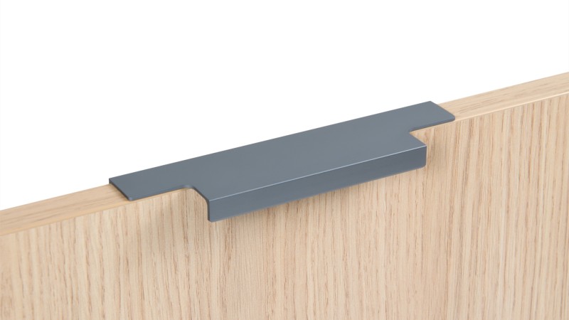 Ручка имеет богатую палитру цветовых решений и разнообразие длин. В зависимости от длины, модель допускает размещение двумя способами — «в размер» фасада и по центру широких фасадов (как большой «язычок»).