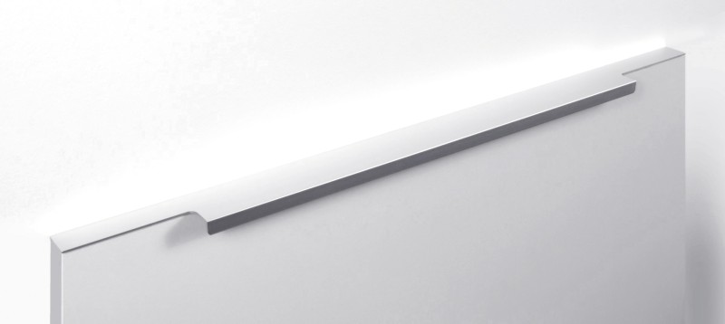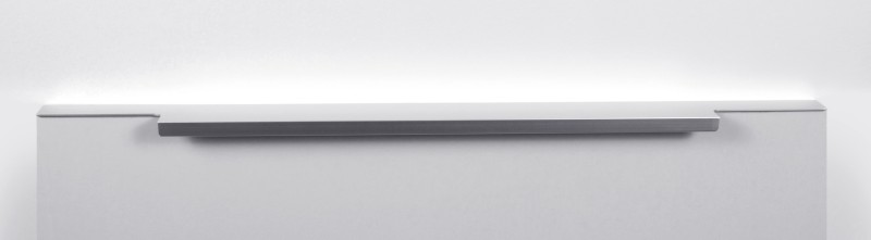 Ручка имеет богатую палитру цветовых решений и разнообразие длин. В зависимости от длины, модель допускает размещение двумя способами — «в размер» фасада и по центру широких фасадов (как большой «язычок»).
